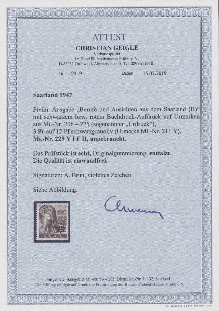 | Zusatzinformationen und Suchstichworte: | Christoph Gärtner 55. Auktion 20. - 24. Februar 2023 Los 6513 D Saarland 1947, Aufdrucke "Saar II", 3 F auf 12 Pfg. Urdruck, der Fehldruck anstatt "2 F", farbfrischer und gut gezähnter Wert, ungebraucht mit Originalgummi sauber entfalzt, wie postfrisch wirkend, signiert Brun sowie weiteres violettes Signum. Fotoattest Geigle BPP "einwandfrei". Mi. 6.000,- € für postfrisch Ausruf 400,00 EUR |