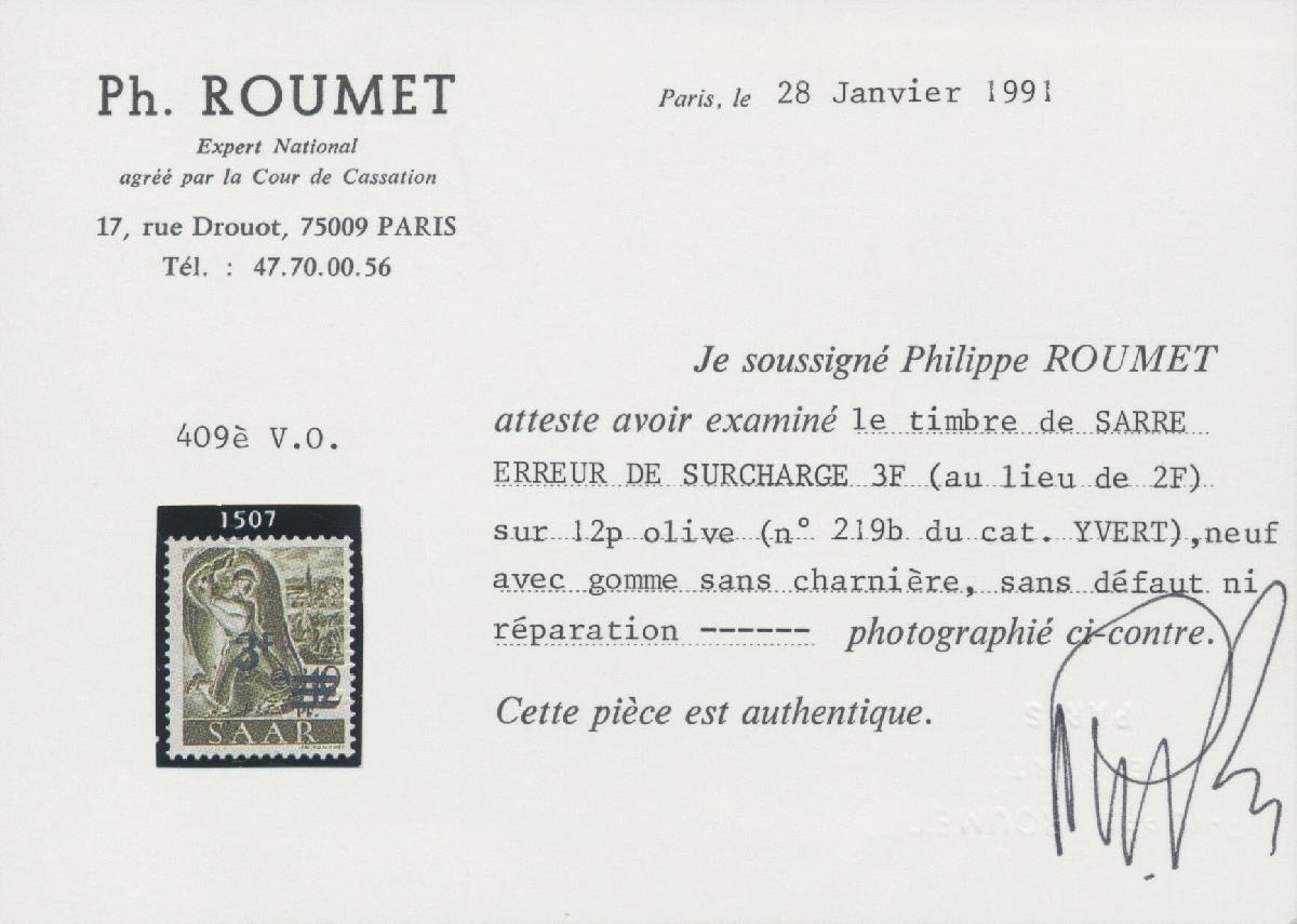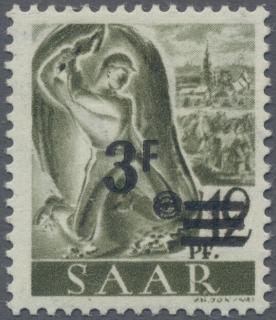 | Zusatzinformationen und Suchstichworte: | Christoph Gärtner 55. Auktion 20. - 24. Februar 2023 Los 6513 D Saarland 1947, Aufdrucke "Saar II", 3 F auf 12 Pfg. Urdruck, der Fehldruck anstatt "2 F", farbfrischer und gut gezähnter Wert, ungebraucht mit Originalgummi sauber entfalzt, wie postfrisch wirkend, signiert Brun sowie weiteres violettes Signum. Fotoattest Geigle BPP "einwandfrei". Mi. 6.000,- € für postfrisch Ausruf 400,00 EUR |