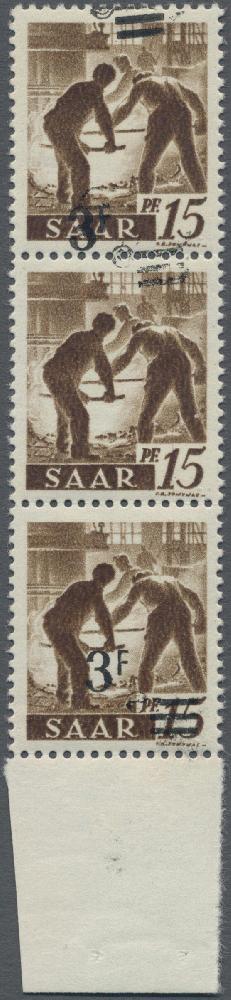 | Zusatzinformationen und Suchstichworte: | Christoph Gärtner 55. Auktion 20. - 24. Februar 2023 Los 6517 D Saarland 1947, Freimarken Saar II 3 F auf 15 Pf im senkrechten postfrischen Dreierstreifen vom Bogenunterrand. Auf der obersten Marke befindet sich ein verschobener Aufdruck, auf der untersten befindet sich ein normaler Aufdruck, die mittlere ist ohne Aufdruck. Aus diesem Dreierstreifen ergibt sich die Kombination "Marke mit und ohne Aufdruck", "echt und einwandfrei" Fotoattest Hoffmann BPP (Mi€450,-) Ausruf 60,00 EUR |