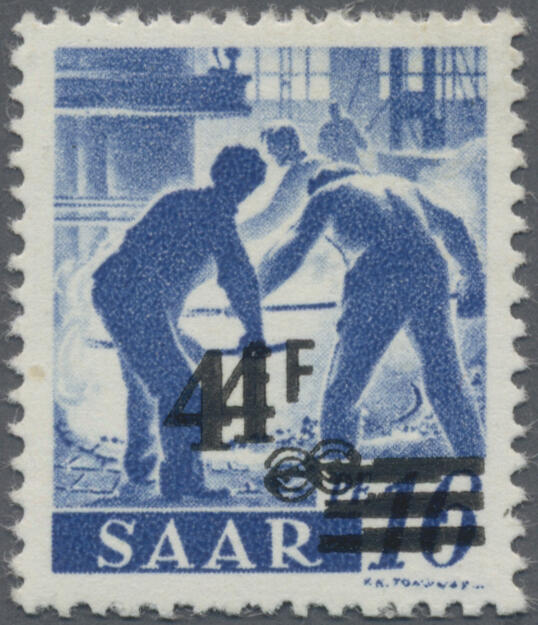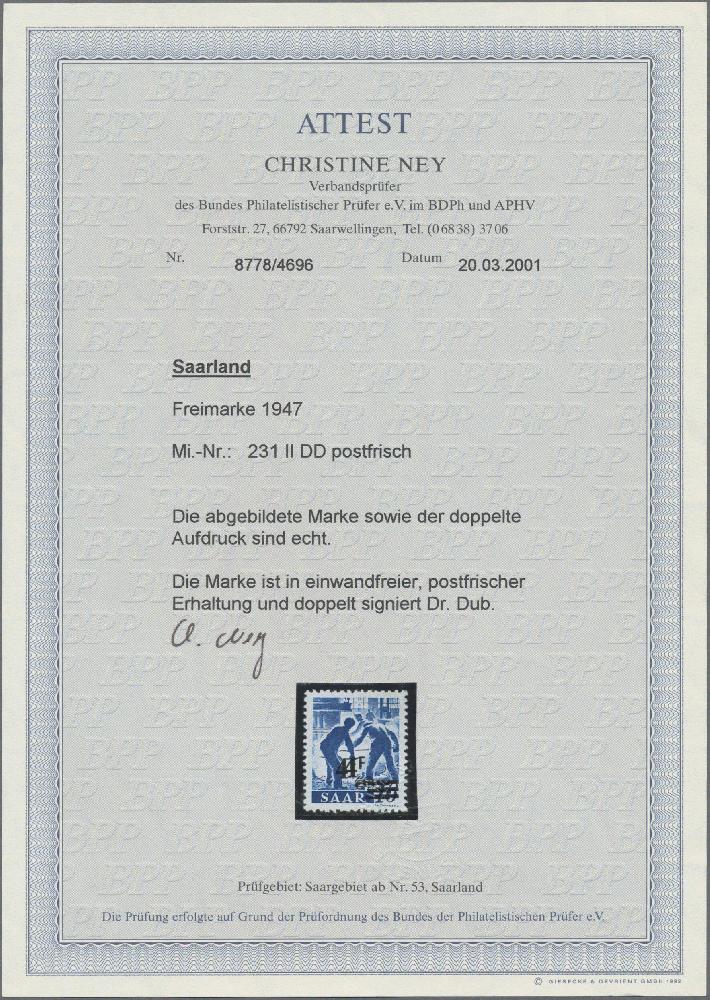 | Zusatzinformationen und Suchstichworte: | Christoph Gärtner 55. Auktion 20. - 24. Februar 2023 Los 6518 D Saarland 1947, 4 Fr auf 16 Pf Saar II, sauber postfrisch mit doppeltem Aufdruck. Doppelt signiert Dr. Dub sowie mit Foto-Attest Ney, BPP(2001): "echt und einwandfrei". (Mi. 650,- €) Ausruf 90,00 EUR |