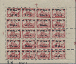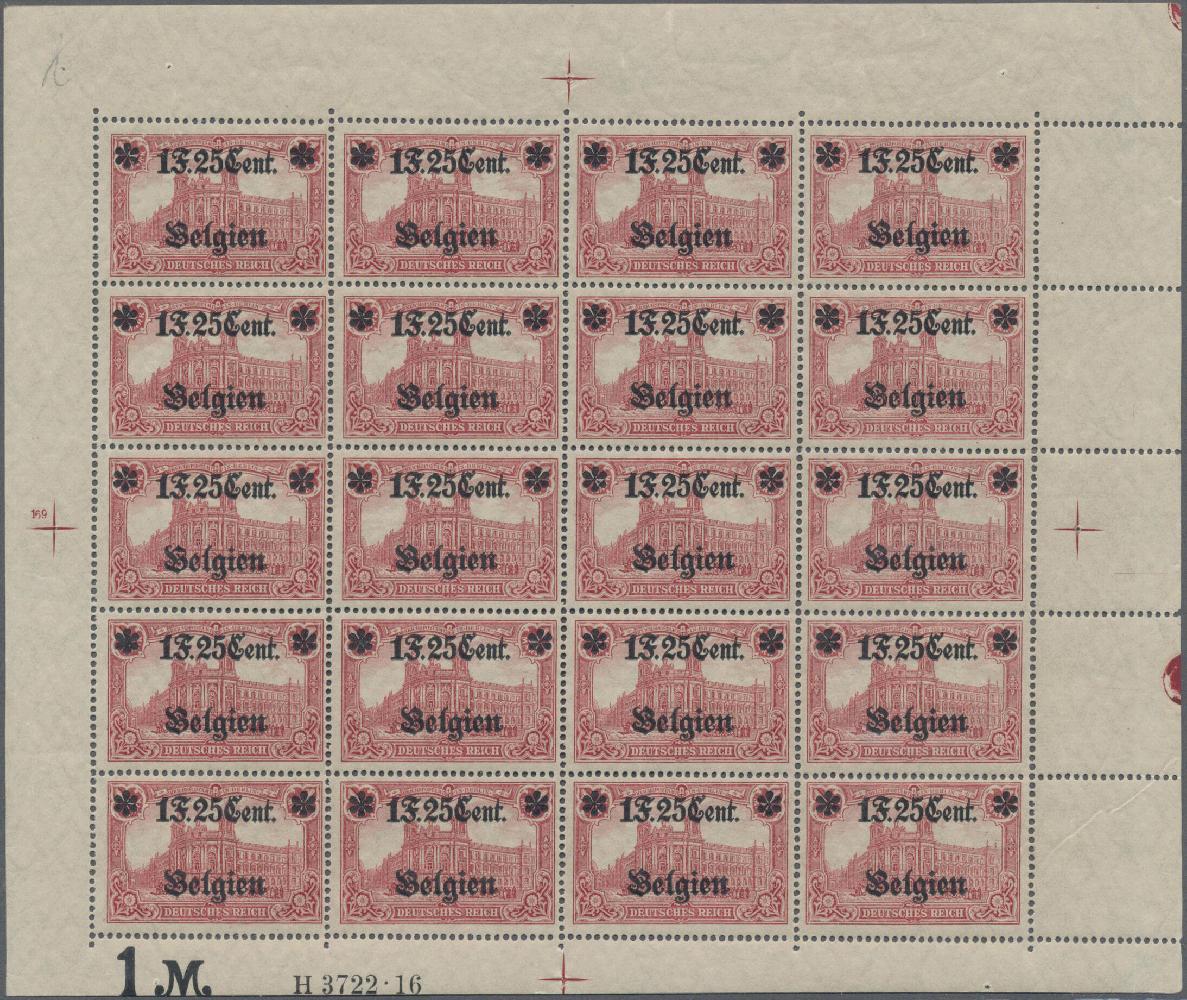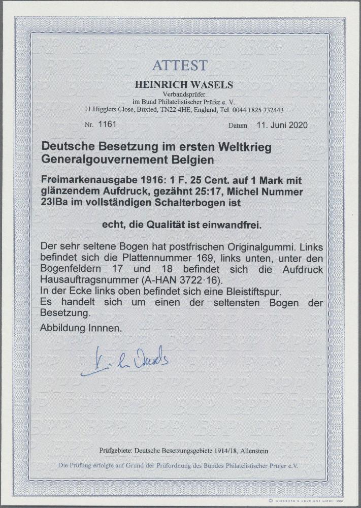 | Zusatzinformationen und Suchstichworte: | Christoph Gärtner 55. Auktion 20. - 24. Februar 2023 Los 5787 D Deutsche Besetzung I. WK Belgien 1916, 1 F. 25 Cent. auf 1 Mark karminrot mit glänzendem Aufdruck, gez. 25:17, vollständiger Schalterbogen von 20 Werten, links mit Plattennummer "169" sowie unten mit Aufdruck-HAN "3722.16", postfrisch mit auch postfrischen Rändern (links oben schwache Bleistiftsignatur), ungefaltet und unsigniert. Fotoattest Wasels BPP "...die Qualität ist einwandfrei...Es handelt sich um einen der seltensten Bogen der Besetzung". (T) Ausruf 3.000,00 EUR |
