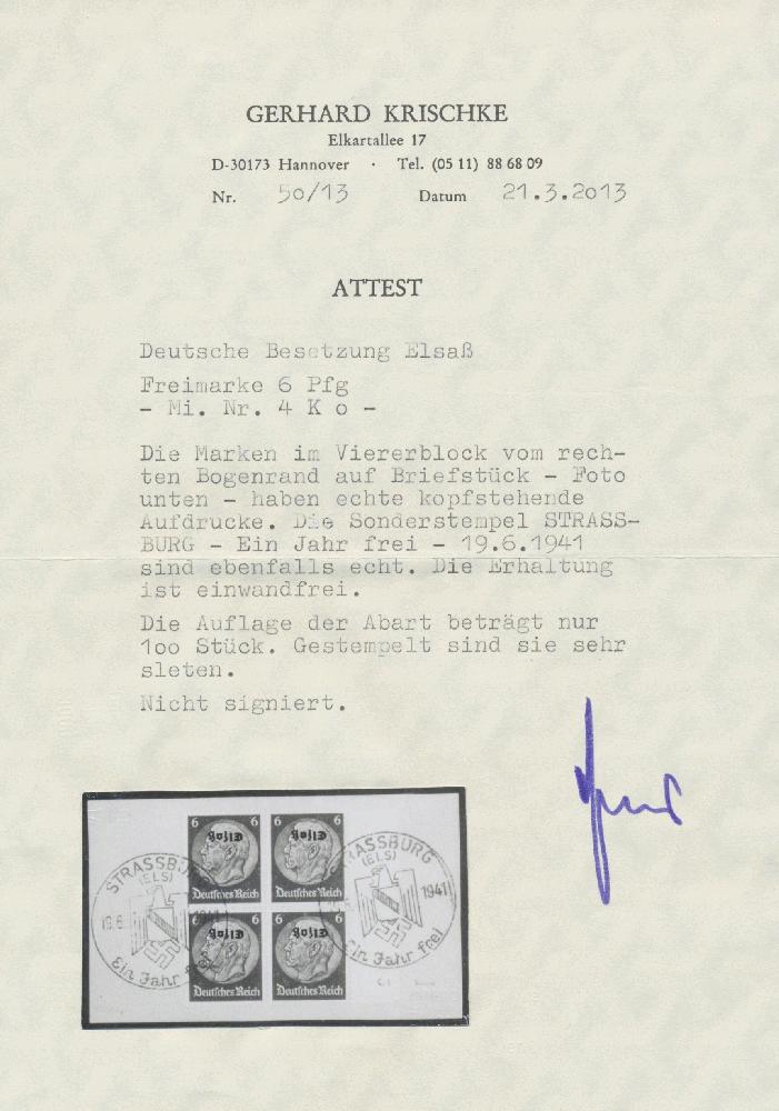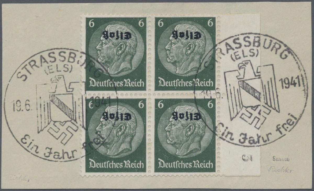 | Zusatzinformationen und Suchstichworte: | Christoph Gärtner 55. Auktion 20. - 24. Februar 2023 Los 6018 D Deutsche Besetzung II. WK Elsass 1941, 6 Pfg Hindenburg im Viererblock mit seltenem KOPFSTEHENDEM" Aufdruck "Elsaß" auf Briefstück mit 2 klaren Sonderstempeln "Strassburg 19.6.1941". Die Auflage dieser Abart betrug nur 100 Exemplare, die wenigsten hiervon jedoch gestempelt. In dieser Form wohl Unikat. Attest Krischke Ausruf 5.000,00 EUR |