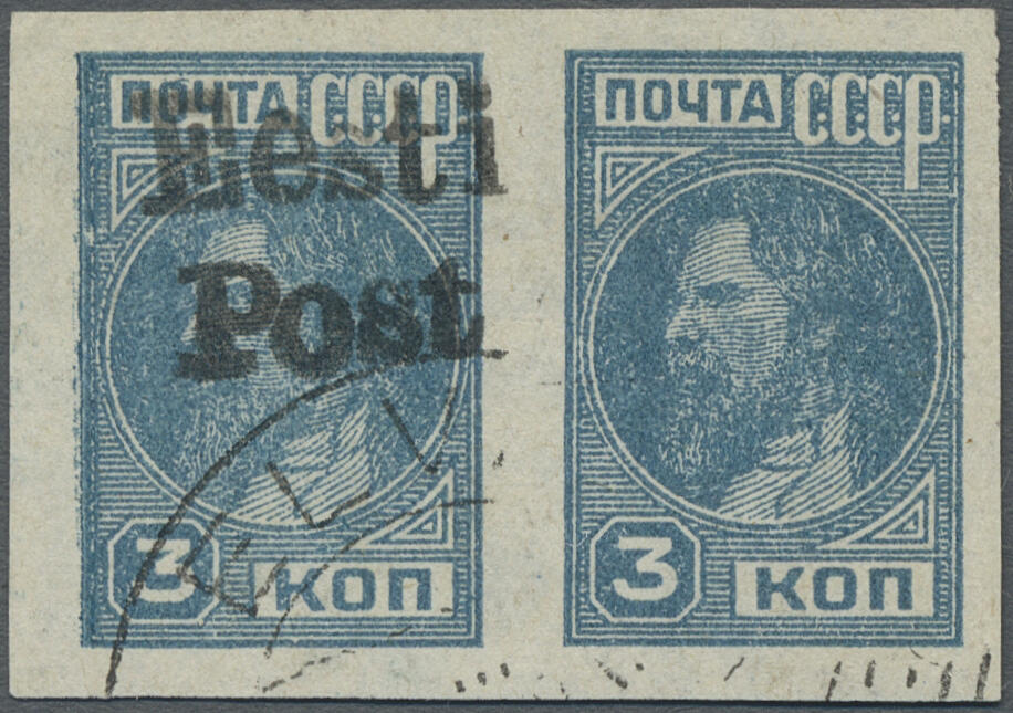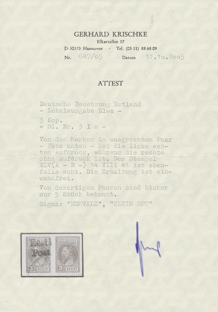 | Zusatzinformationen und Suchstichworte: | Christoph Gärtner 55. Auktion 20. - 24. Februar 2023 Los 6023 D Deutsche Besetzung II. WK Estland Elwa 1941, 3 K. blau im waagerechten Paar, dabei rechte Marke "ohne Aufdruck", entwertet "Elva /14.VIII.41", einwandfrei auch nach Fotoattest Krischke BPP (2005), seinerzeit waren lediglich fünf Paare dieser Art bekannt. Außerdem geprüft Nemvalz bzw. Klein BPP Ausruf 800,00 EUR |