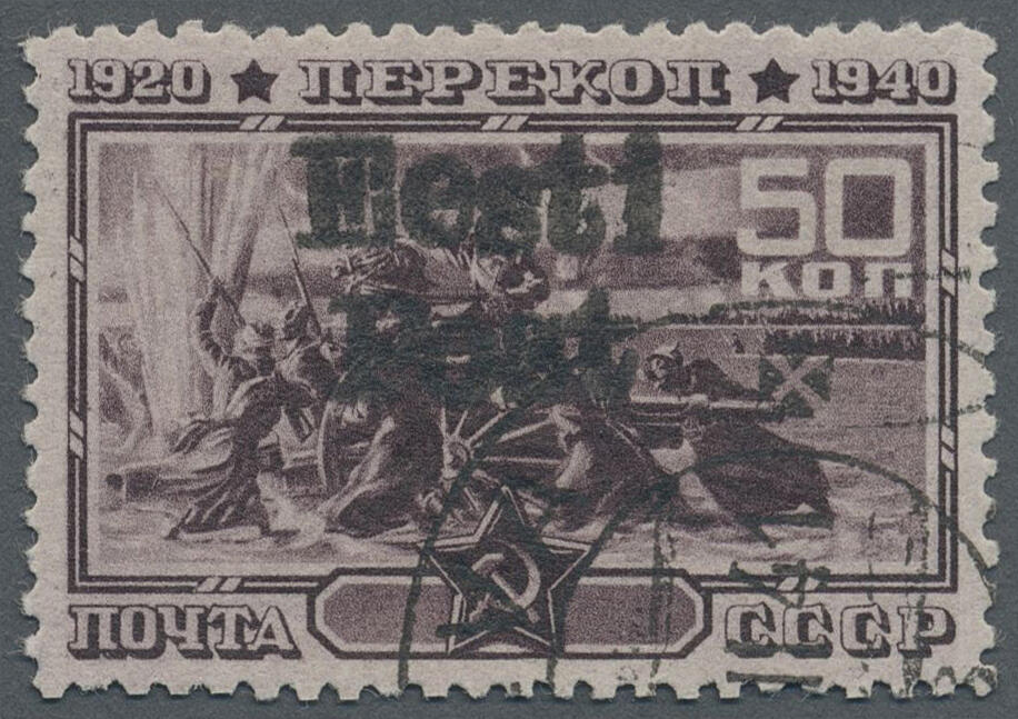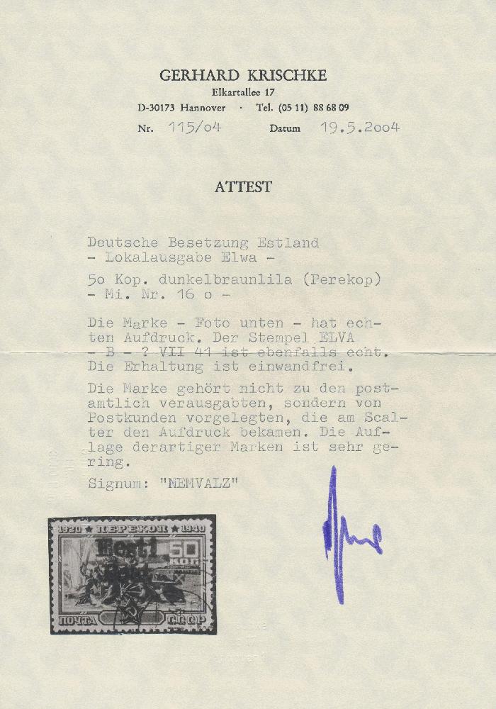 | Zusatzinformationen und Suchstichworte: | Christoph Gärtner 55. Auktion 20. - 24. Februar 2023 Los 6025 D Deutsche Besetzung II. WK Estland Elwa 1941, 50 K schwärzlichlilakarmin "Perekop" mit Aufdruck "Eesti Post", gebraucht mit Teilstempel ELVA B, (..)VII.41, tadellose Erhaltung. Diese Marke gehört zu den Ausgaben, welche den Aufdruck erst bei der Vorlage durch Postkunden am Schalter erhielten. Die Auflage dieser Marke ist SEHR GERING! GROßE RARITÄT der deutschen Besetzungsausgaben im II. Weltkrieg. Signiert Nemvalz. Attest Krischke und Löbbering BPP (2022) Ausruf 800,00 EUR |