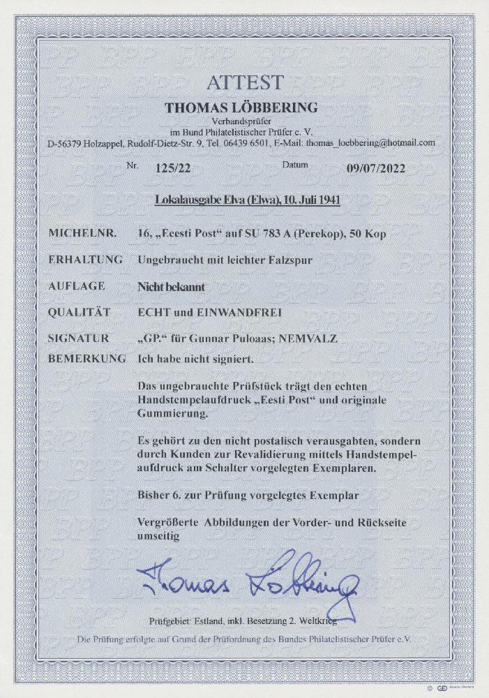 | Zusatzinformationen und Suchstichworte: | Christoph Gärtner 55. Auktion 20. - 24. Februar 2023 Los 6025 D Deutsche Besetzung II. WK Estland Elwa 1941, 50 K schwärzlichlilakarmin "Perekop" mit Aufdruck "Eesti Post", gebraucht mit Teilstempel ELVA B, (..)VII.41, tadellose Erhaltung. Diese Marke gehört zu den Ausgaben, welche den Aufdruck erst bei der Vorlage durch Postkunden am Schalter erhielten. Die Auflage dieser Marke ist SEHR GERING! GROßE RARITÄT der deutschen Besetzungsausgaben im II. Weltkrieg. Signiert Nemvalz. Attest Krischke und Löbbering BPP (2022) Ausruf 800,00 EUR |
