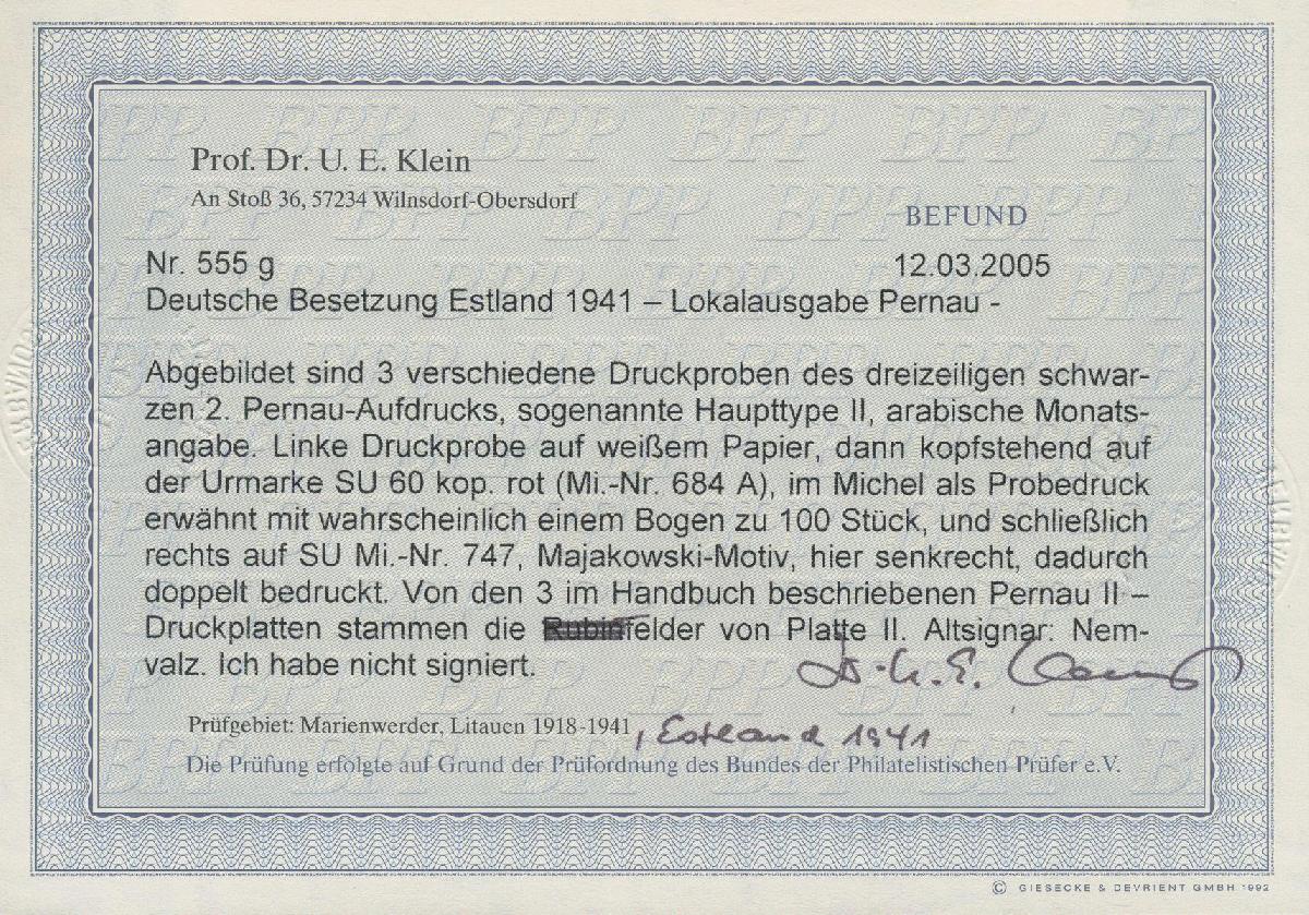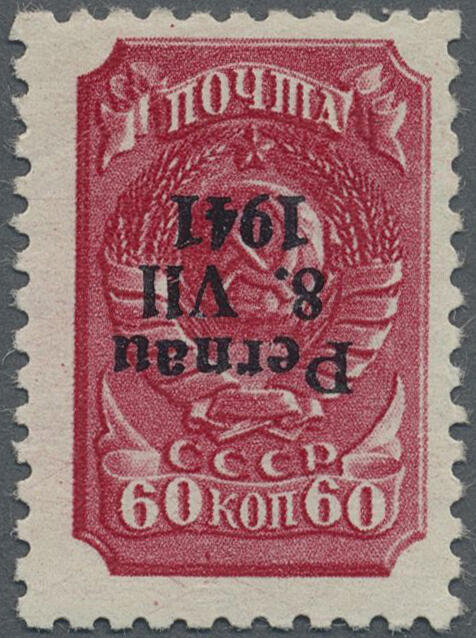 | Zusatzinformationen und Suchstichworte: | Christoph Gärtner 55. Auktion 20. - 24. Februar 2023 Los 6033 D Deutsche Besetzung II. WK Estland Lok Pernau 1941, 60 K lilakarmin Freimarke "Werktätige" (Sowjetunion MiNr.684), als PROBEDRUCK mit KOPFSTEHENDEM Aufdruck in Type II (Druckfeld 96), postfrisch mit vollem Originalgummi in tadelloser Erhaltung. Von diesem Probedruck sind nur SEHR WENIGE Exemplare bekannt! GROSSE RARITÄT der deutschen Besetzungsausgaben im II. Weltkrieg. Fotobefund Prof. Dr. Klein und Fotoattest Krischke Ausruf 1.300,00 EUR |