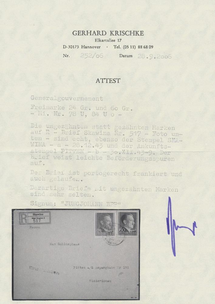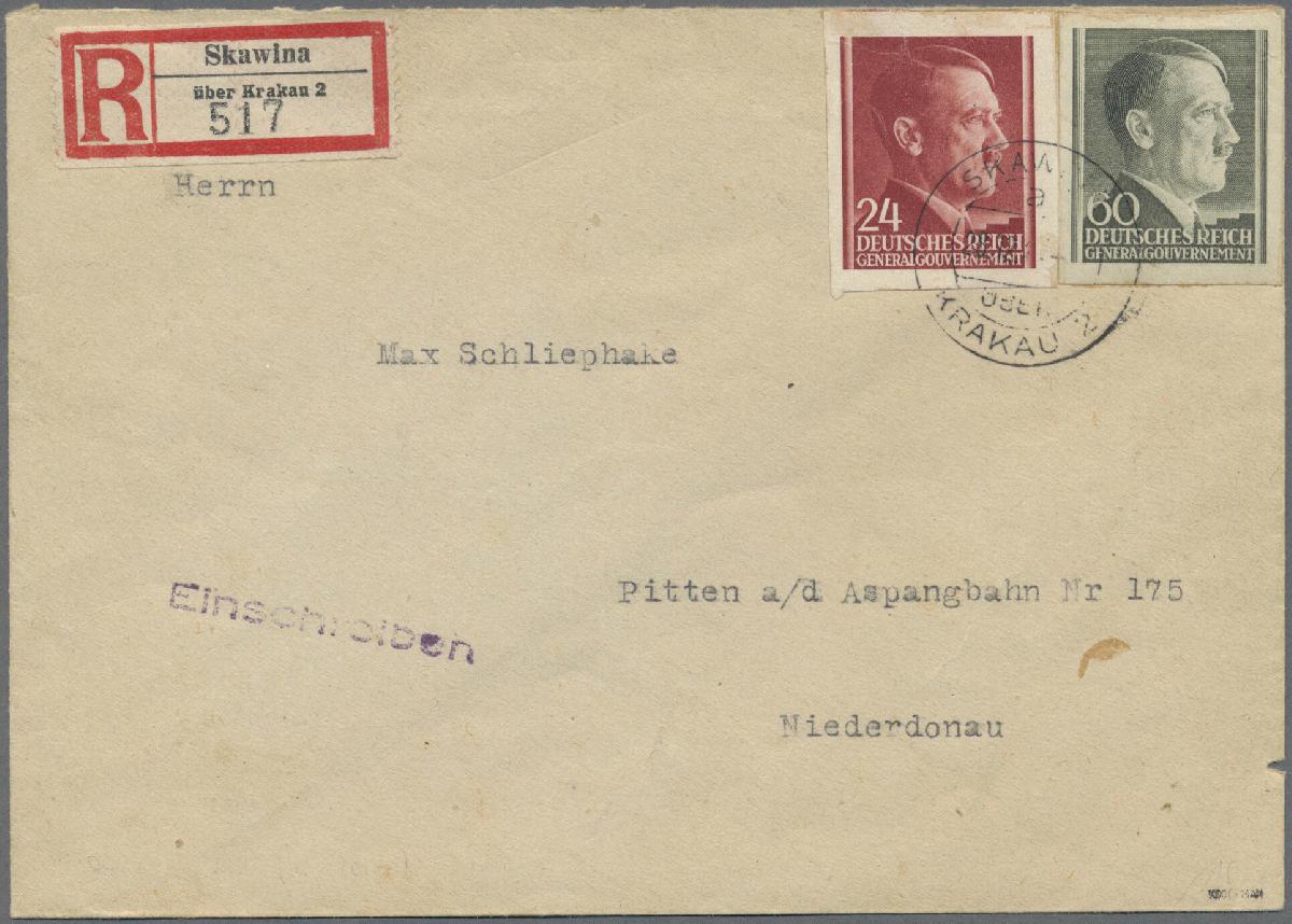 | Zusatzinformationen und Suchstichworte: | Christoph Gärtner 55. Auktion 20. - 24. Februar 2023 Los 6049 D Generalgouvernement 1942, Hitler 60 Gr schwarzoliv und 24 Gr. schwärzlichbräunlichrot, UNGEZÄHNT, 2 Prachtstücke auf portogerechtem R-Brief (leichte Beförderungsspuren) aus "SKAWINA 28.12.43" nach "PITTEN 30.XII.43". Herausragendes Belegstück mit portogerechter Mischfrankatur zweier ungezähnter Werte (INSBESONDERE DIE SEHR SELTENE 60 Gr), geprüft Jungjohann, Fotoattest Krische: "... derartige Briefe mit ungezähnten Marken sind sehr selten." RR! Ausruf 1.400,00 EUR |