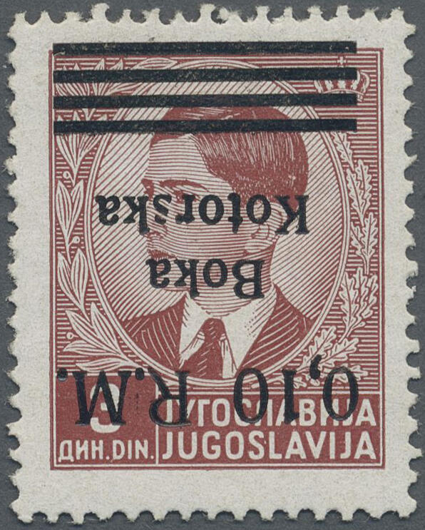 | Zusatzinformationen und Suchstichworte: | Christoph Gärtner 55. Auktion 20. - 24. Februar 2023 Los 6051 D Deutsche Besetzung II. WK Kotor 1944, 0,10 M auf 3 D lebhaftbraunrot, mit KOPFSTEHENDEM Aufdruck, postfrisch mit vollem Originalgummi, tadellose Erhaltung. Sehr seltene Abart! Signiert Ludin BPP und Fotoattest Krischke Ausruf 200,00 EUR |