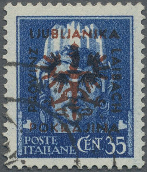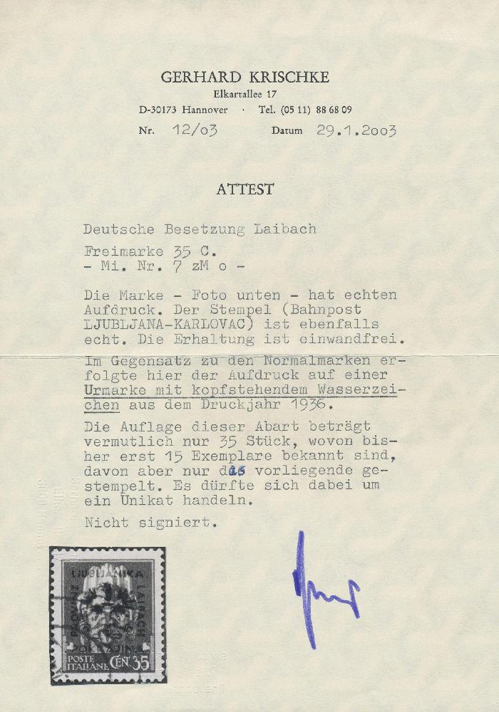 | Zusatzinformationen und Suchstichworte: | Christoph Gärtner 55. Auktion 20. - 24. Februar 2023 Los 6055 D Deutsche Besetzung II. WK Laibach 1944, 35 C schwärzlichkobalt, Aufdruck II dunkelrosarot, mit KOPFSTEHENDEM Wasserzeichen, entwertet mit Teilstempel der Bahnpost LJUBLJANA-KARLOVAC, tadellose Erhaltung. Die Auflage dieser Wasserzeichen-Abart beträgt vermutlich nur 35 Stück, von den 15 bekannten Exemplaren ist nur dieses eine gestempelt und somit ein UNIKAT! Fotoattest Krischke. Mi. "-.-" Ausruf 4.000,00 EUR |