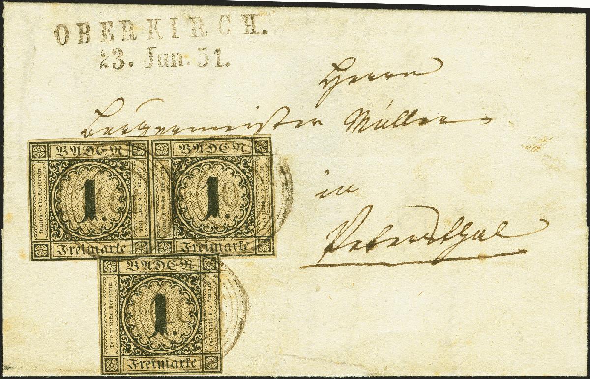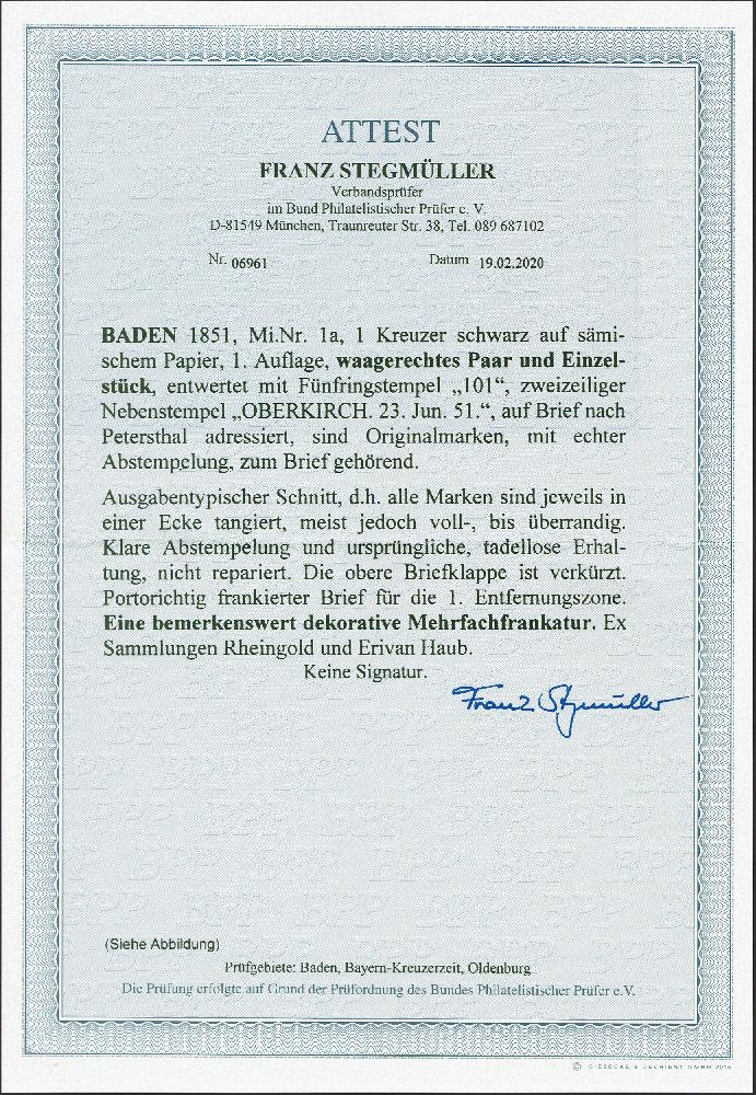 | Zusatzinformationen und Suchstichworte: | 380. Auktion Heinrich Köhler Auktionstermin 25.03.2023 Los 1 1851, 1. Auflage: 1 Kreuzer auf sämisch, waagerechtes Paar und Einzelmarke, farbfrisch und in ausgabetypischem Schnitt, meist voll- bis überrandig, mit einzeln aufgesetzter Nr. "101" und sauber nebengesetztem Langstempel "OBERKIRCH 23 Jun.51" auf kleinem Faltbrief (obere Rückklappe verkürzt) nach Petersthal. Schöne und tadellose Erhaltung. Ein attraktiver und seltener Brief. Fotoattest Stegmüller BPP (2020) Ausruf 1.500,00 EUR Zuschlag 1.700,00 EUR (aus der Sammlung Erivan Haub) |