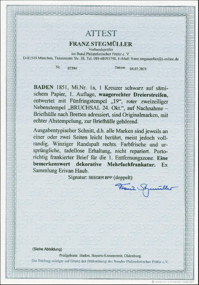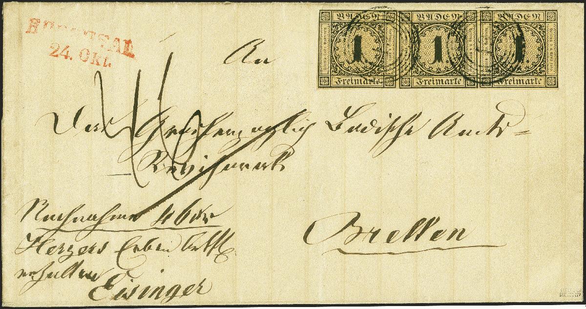 | Zusatzinformationen und Suchstichworte: | 380. Auktion Heinrich Köhler Auktionstermin 25.03.2023 Los 2 1851, 1. Auflage: 1 Kreuzer auf sämisch, waagerechter Dreierstreifen, sehr schön farbfrisch und in ausgabetypischem Schnitt, meist vollrandig, mit paarweise aufgesetzter Nr. "19" und sauber nebengesetztem roten Langstempel "BRUCHSAL 24. Okt." auf Nachnahme-Briefhülle nach Bretten. Rechts winziger Randspalt, sonst tadellos. Eine attraktive und seltene Frankatur in sehr schöner Erhaltung. Signiert Seeger BPP und Fotoattest Stegmüller BPP (2021) Ausruf 1.500,00 EUR Zuschlag 3.800,00 EUR (aus der Sammlung Erivan Haub) |