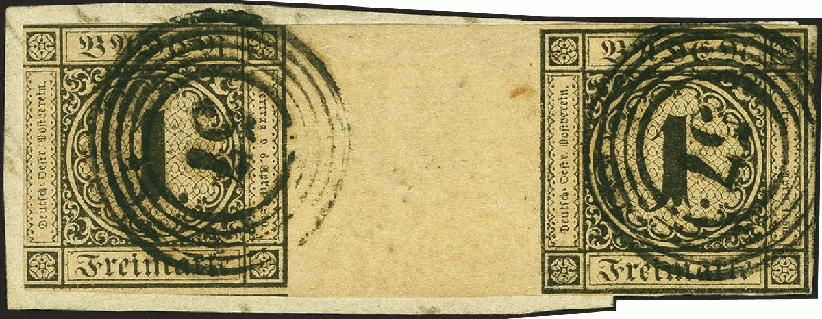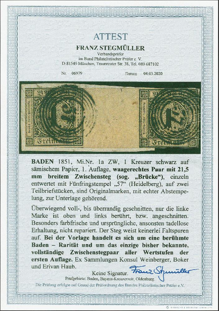 | Zusatzinformationen und Suchstichworte: | 380. Auktion Heinrich Köhler Auktionstermin 25.03.2023 Los 3 1851, 1. Auflage: 1 Kreuzer auf sämisch, waagerechtes Brücken-Paar mit 21,5 mm breitem Zwischensteg, links etwas berührt, sonst voll- bis breitrandig, mit sauber aufgesetzter Nr. "57" HEIDELBERG auf zwei Teilbriefstücken. Tadellose und ursprüngliche, frische Erhaltung. Diese Stück gehört zu den großen Seltenheiten der Baden- und Altdeutschland-Philatelie. Es ist das einzige vollständige Zwischenstegpaar der Marken der 1. Auflage von 1851. Fotoattest Stegmüller BPP (2020) Ausruf 50.000,00 EUR Zuschlag 210.000,00 EUR (aus der Sammlung Erivan Haub) |