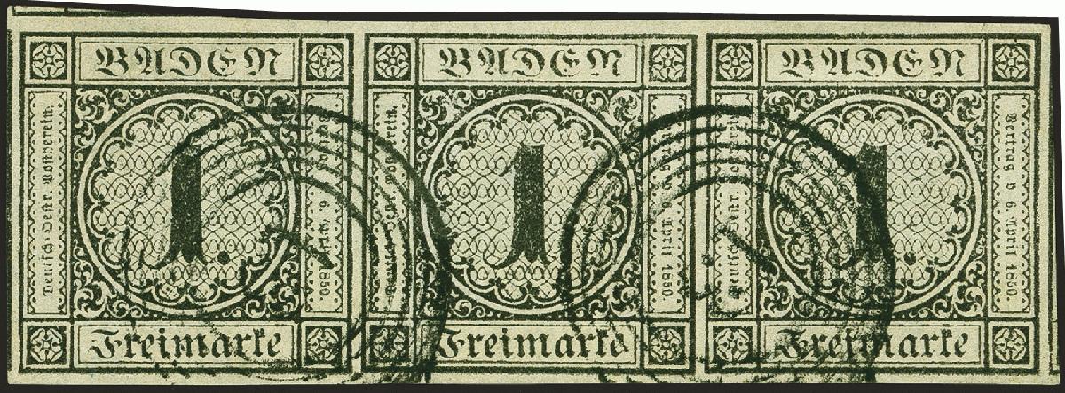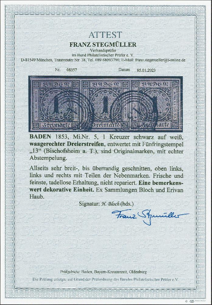 | Zusatzinformationen und Suchstichworte: | 380. Auktion Heinrich Köhler Auktionstermin 25.03.2023 Los 8 1853,1 Kreuzer schwarz im waagerechten 3er-Streifen, farbfrisch und allseits sehr breit- bis überrandig mit Teilen von 3 Nachbarmarken, leicht und sauber entwertet durch Nr. "13" BISCHOFSHEIM a. T. Ein Ausnahmestück in tadelloser Erhaltung. Signiert Bloch und Fotoattest Stegmüller BPP (2023) Ausruf 100,00 EUR Zuschlag 420,00 EUR (aus der Sammlung Erivan Haub) |
