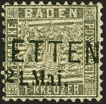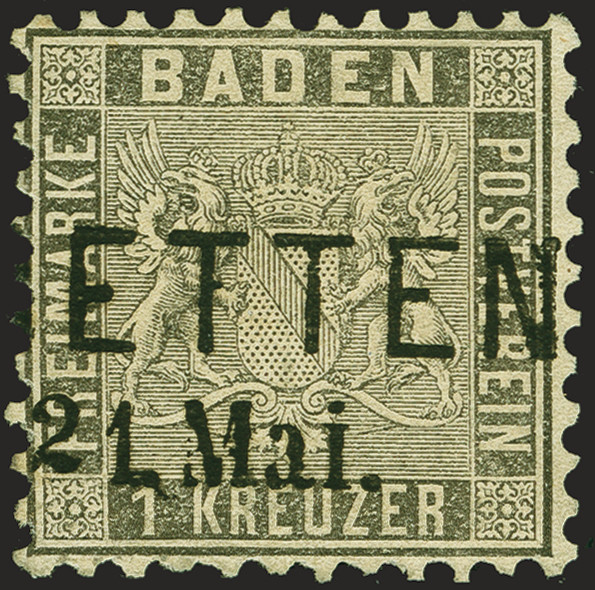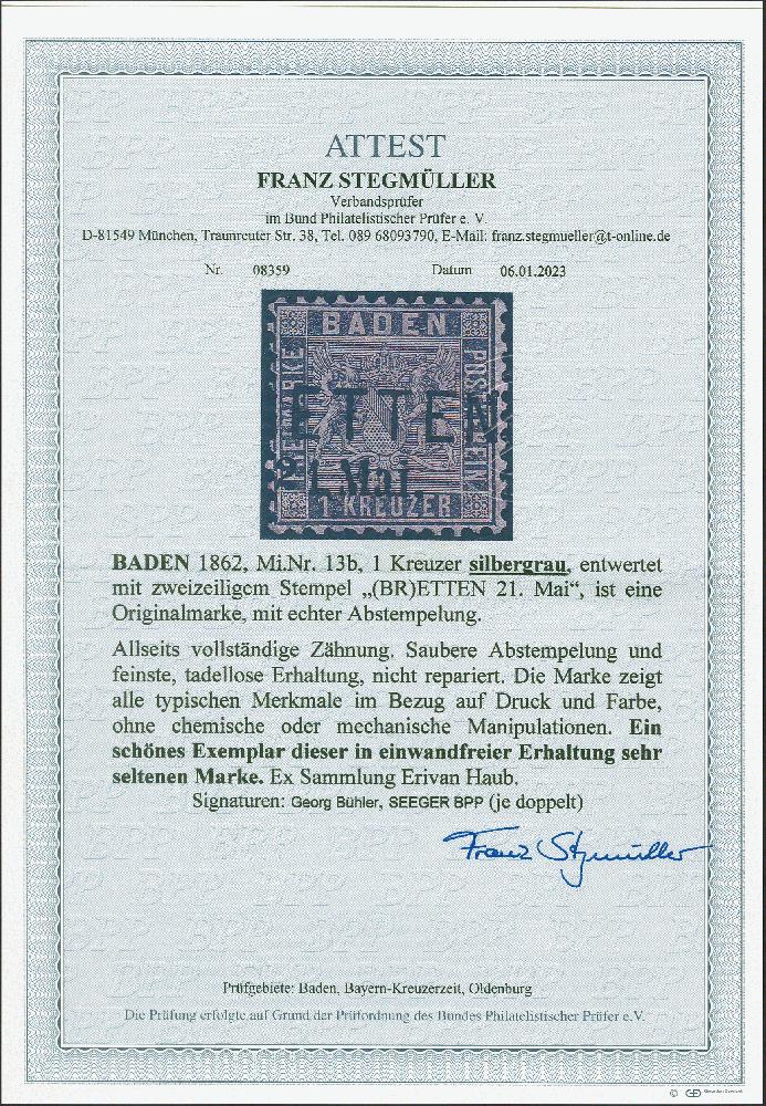 | Zusatzinformationen und Suchstichworte: | 380. Auktion Heinrich Köhler Auktionstermin 25.03.2023 Los 11 1862/63,1 Kreuzer silbergrau, farbfrisch in der typischen Nuance, tadellos gezähnt, sehr schön entwertet durch gerade und klar aufgesetzten Langstempel "BRETTEN 21. Mai". Eine außerordentlich seltene Marke in tadelloser Erhaltung; zweifellos eines der schönsten Stücke der seltenen Farbe. Signiert Bühler und Seeger BPP, Fotoattest Stegmüller BPP (2023) Ausruf 3.000,00 EUR Zuschlag 10.500,00 EUR (aus der Sammlung Erivan Haub) |