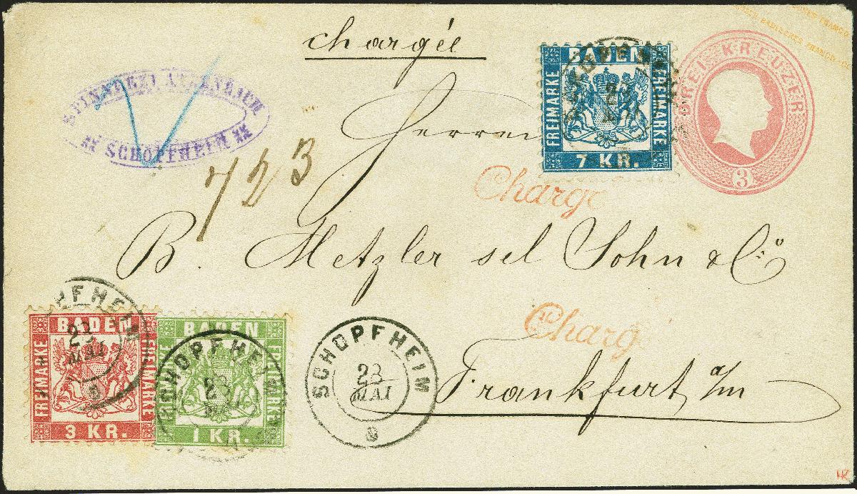 | Zusatzinformationen und Suchstichworte: | 380. Auktion Heinrich Köhler Auktionstermin 25.03.2023 Los 18 1 Kreuzer grün, 3 Kreuzer rot und 7 Kreuzer blau, die komplette Ausgabe, farbfrisch und gut gezähnt, mit jeweils sauber auf- und nebengesetztem Doppelkreisstempel "SCHOPFHEIM 23 MAI" als Zufrankatur auf Ganzsachenumschlag 3 Kreuzer blassrosa als Chargé-Brief der 2.Gewichtsstufe nach Frankfurt a. M. Die Verschlussklappe ist unvollständig, sonst frische und tadellose Erhaltung. Eine seltene und attraktive Frankaturkombination. Signiert HK, Fotoattest Stegmüller BPP (2023) Ausruf 1.000,00 EUR Zuschlag 4.000,00 EUR (aus der Sammlung Erivan Haub) |
