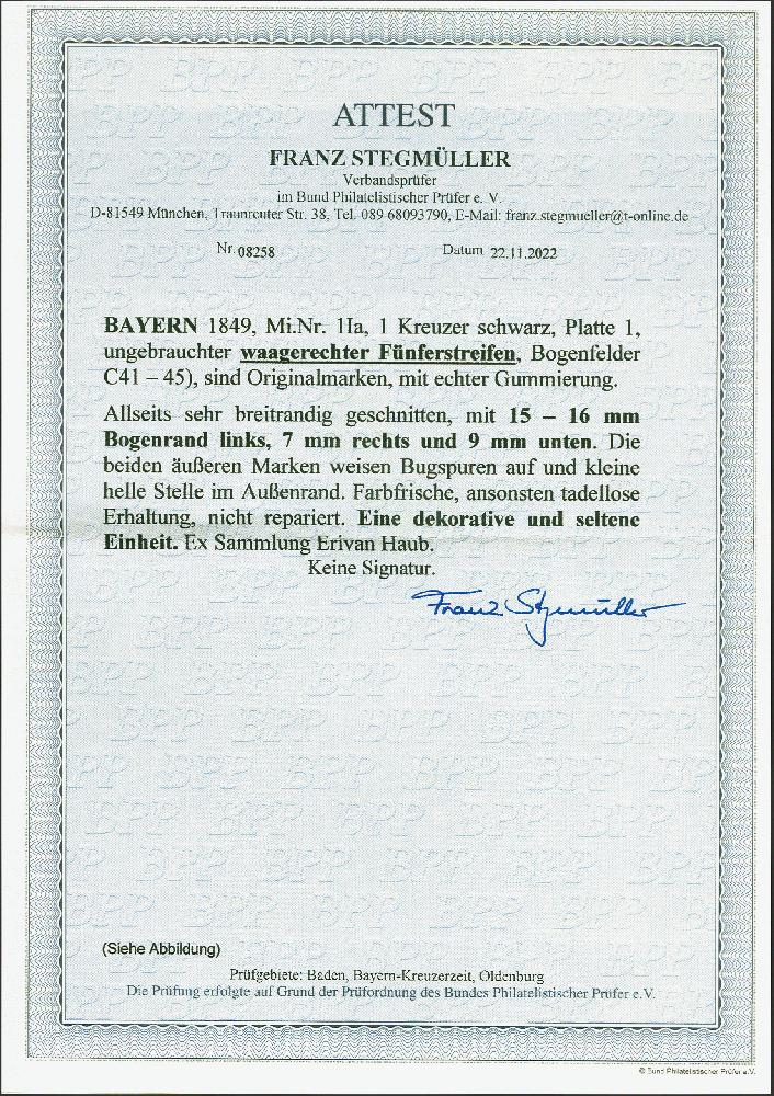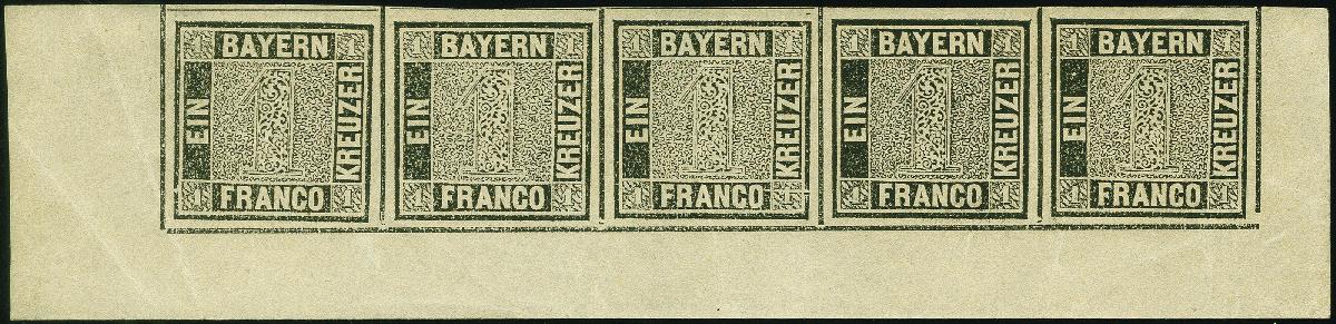 | Zusatzinformationen und Suchstichworte: | 380. Auktion Heinrich Köhler Auktionstermin 25.03.2023 Los 20 1 Kreuzer grauschwarz im waagerechten 5er-Streifen, farbfrisch und allseits breitrandig, dreiseitig mit breitem Bogenrand, ungebraucht mit originalem Gummi. Im linken Bogenrand 2 diagonale Büge, sonst, bis auf leichte Büge bei den beiden äußeren Marken, einwandfrei. Eine attraktive und seltene Einheit. Fotoattest Stegmüller BPP (2022) Ausruf 3.000,00 EUR Zuschlag 6.000,00 EUR (aus der Sammlung Erivan Haub) |