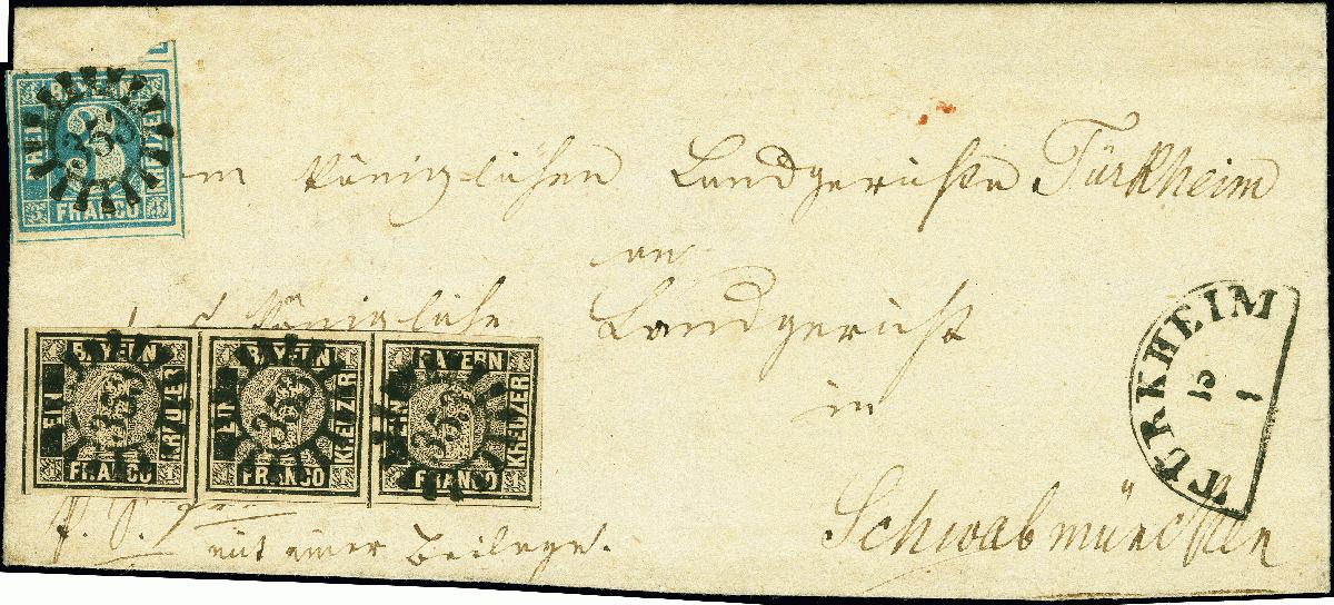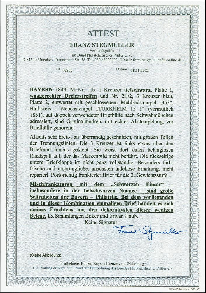 | Zusatzinformationen und Suchstichworte: | 380. Auktion Heinrich Köhler Auktionstermin 25.03.2023 Los 21 1 Kreuzer tiefschwarz, Platte I, waagerechter 3er-Streifen, in Mischfrankatur mit 1850, 3 Kreuzer blau, alle farbfrisch und voll- bis meist breitrandig geschnitten, ganz überwiegend mit Zwischenlinien, mit jeweils klar aufgesetztem gMR "353" und sauber nebengesetztem Halbkreisstempel "TÜRKHEIM 15 1" auf doppelt verwendeter Gerichtsbrief-Hülle der 2. Gewichtsstufe ("mit einer Beilage") nach Schwabmünchen. Die 3 Kreuzer links gering über den Rand geklebt und dort kleine Beanstandungen, sonst tadellose und sehr frische Erhaltung. Es sind insgesamt 10 Farb- und Mischfrankaturen der Bayern Nr. 1 registriert, davon 4 Stück mit einem 3er-Streifen. In dieser Kombination ein einmaliges und darüber hinaus äußerst attraktives Stück. Fotoattest Stegmüller BPP (2022) Ausruf 40.000,00 EUR Zuschlag 75.000,00 EUR (aus der Sammlung Erivan Haub) |