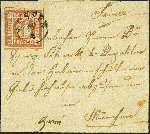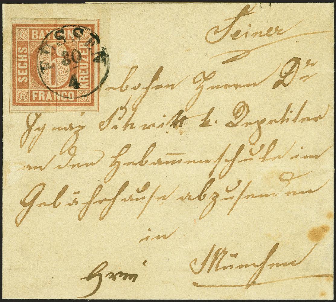 | Zusatzinformationen und Suchstichworte: | 380. Auktion Heinrich Köhler Auktionstermin 25.03.2023 Los 23 6 Kreuzer braunorange, farbfrisch und voll- bis breitrandig, dreiseitig mit Schnittlinien, mit alleiniger Entwertung durch sauber aufgesetzten Fingerhutstempel "FÜSSEN 30/4" auf kleiner Briefhülle mit Teil des Inhaltes nach München. Die Rückklappen nicht ganz komplett und außerhalb der Frankatur einige kleine Stockflecken, sonst einwandfrei. Signiert Brettl BPP und Fotoattest Sem BPP (2022) Ausruf 500,00 EUR Zuschlag 650,00 EUR (aus der Sammlung Erivan Haub) |