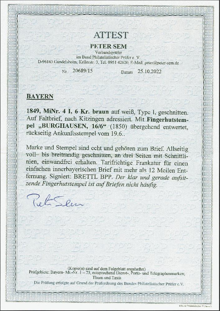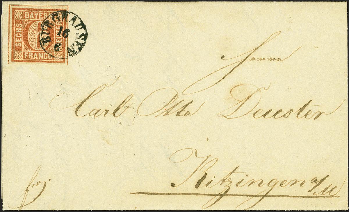 | Zusatzinformationen und Suchstichworte: | 380. Auktion Heinrich Köhler Auktionstermin 25.03.2023 Los 24 6 Kreuzer braunorange, farbfrisch und allseits breitrandig, dreiseitig mit Schnittlinien, mit alleiniger Entwertung durch glasklar aufgesetzten Fingerhutstempel "BURGHAUSEN 16/6" (1850) auf komplettem Faltbrief nach Kitzingen. Ein besonders schöner Brief in frischer und tadelloser Erhaltung. Fotoattest Sem BPP (2022) Ausruf 1.000,00 EUR Zuschlag 2.900,00 EUR (aus der Sammlung Erivan Haub) |