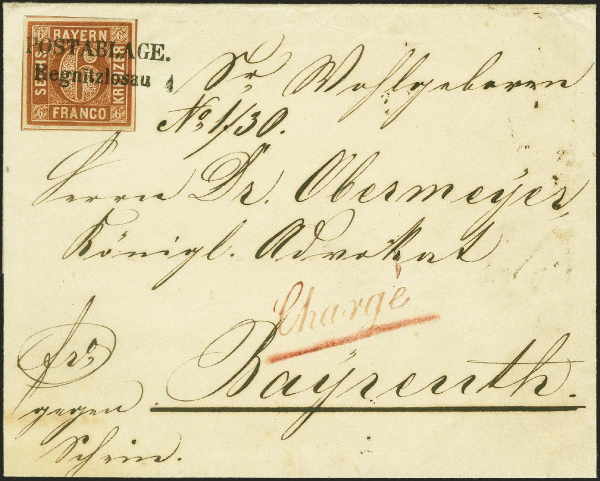 | Zusatzinformationen und Suchstichworte: | 380. Auktion Heinrich Köhler Auktionstermin 25.03.2023 Los 29 6 Kreuzer braun, farbfrisch und allseits breitrandig, mit klar aufgesetztem Langstempel "POSTABLAGE Regnitzlosau" auf eingeschriebener Briefhülle mit rotem Schreibschriftstempel "Chargé" nach Bayreuth. Ein attraktiver Brief in tadelloser Erhaltung. Fotobefund Sem BPP (2001) Ausruf 150,00 EUR Zuschlag 1.000,00 EUR (aus der Sammlung Erivan Haub) |