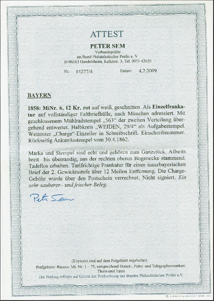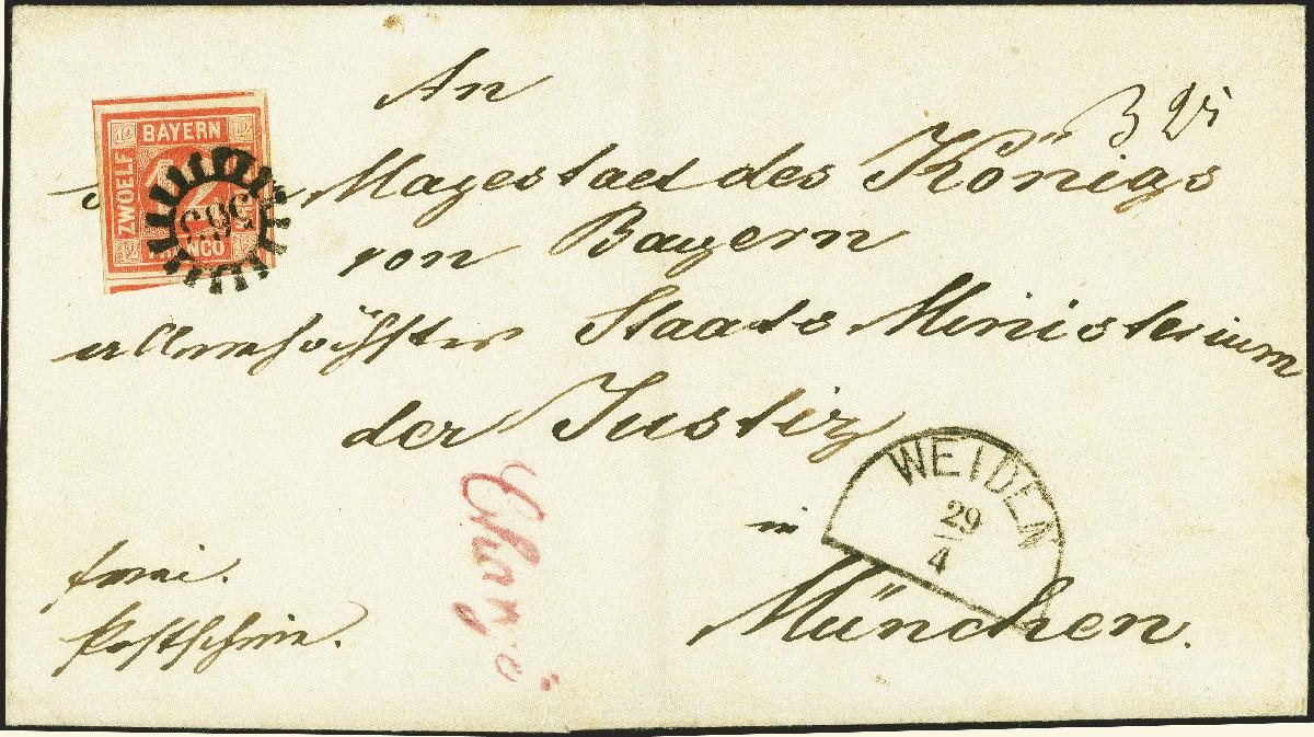 | Zusatzinformationen und Suchstichworte: | 380. Auktion Heinrich Köhler Auktionstermin 25.03.2023 Los 31 12 Kreuzer rot, farbfrisch und voll- bis überrandig, mit sauber aufgesetztem gMR "563" und sauber nebengesetztem Halbkreis "WEIDEN 29/4" auf Charge-Briefhülle der 2.Gewichtsstufe an das Justizministerium in München. Eine attraktive Einzelfrankatur in einwandfreier Erhaltung. Fotoattest Sem BPP (2009) Ausruf 300,00 EUR Zuschlag 1.000,00 EUR (aus der Sammlung Erivan Haub) |