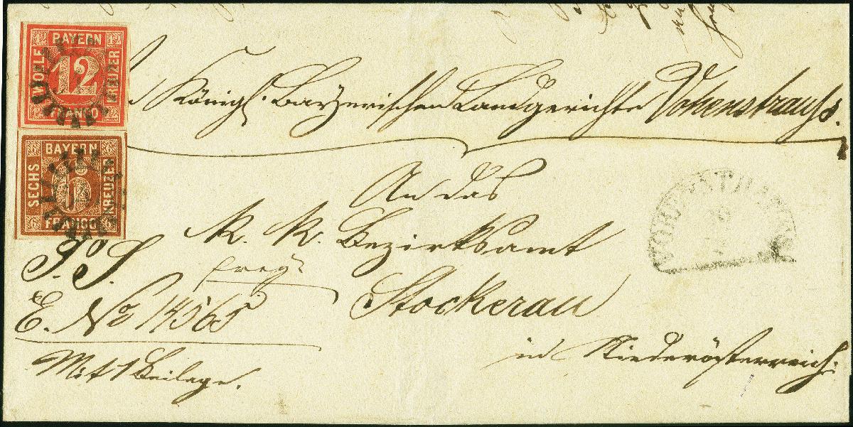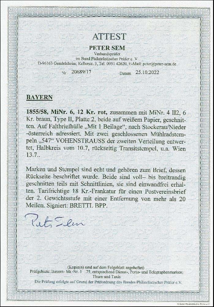 | Zusatzinformationen und Suchstichworte: | 380. Auktion Heinrich Köhler Auktionstermin 25.03.2023 Los 32 12 Kreuzer rot und 6 Kreuzer braun, beide farbfrisch und voll- bis breitrandig, mit gMR "547" und nebengesetztem Halbkreis "VOHENSTRAUSS 10/7" auf Briefhülle der 2. Gewichtsstufe nach Stockerau in Niederösterreich. Eine attraktive und recht seltene Farbfrankatur im Wechselverkehr mit Österreich. Signiert Brettl BPP und Fotoattest Sem BPP (2022) Ausruf 200,00 EUR Zuschlag 600,00 EUR (aus der Sammlung Erivan Haub) |