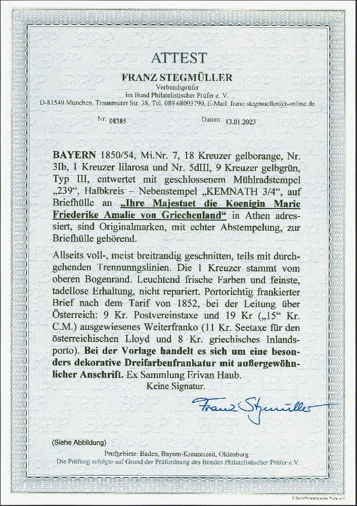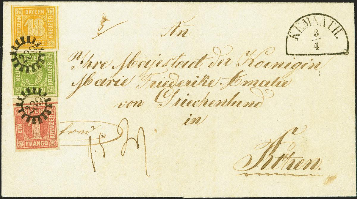 | Zusatzinformationen und Suchstichworte: | 380. Auktion Heinrich Köhler Auktionstermin 25.03.2023 Los 33 18 Kreuzer gelborange, 9 Kreuzer gelbgrün und 1 Kreuzer lilarosa, alle farbfrisch und voll- bis breitrandig, teils mit Trennungslinien, die 1 Kreuzer mit schmalem oberen Bogenrand, sehr schön entwertet durch nur 2 mal aufgesetztem gMR "239" auf Briefhülle mit sauber nebengesetztem Halbkreisstempel "KEMNATH 3/4" an "Ihre Majestät der Königin Marie Friederike Amalie von Griechenland in Athen". Der Brief ist nach dem Tarif von 1852 für den Leitweg über Österreich portogerecht frankiert mit 9 Kreuzer Vereinsporto, 11 Kreuzern österreichischem Seeporto und 8 Kreuzern griechischem Inlandsporto. Bayern-Briefe der Kreuzerzeit nach Griechenland sind außerordentlich selten, mit der seltenen 3 Farben-Frankatur und der königlichen Adresse ein absolutes Ausnahmestück. Fotoattest Stegmüller BPP (2023) Ausruf 8.000,00 EUR Zuschlag 52.000,00 EUR (aus der Sammlung Erivan Haub) |