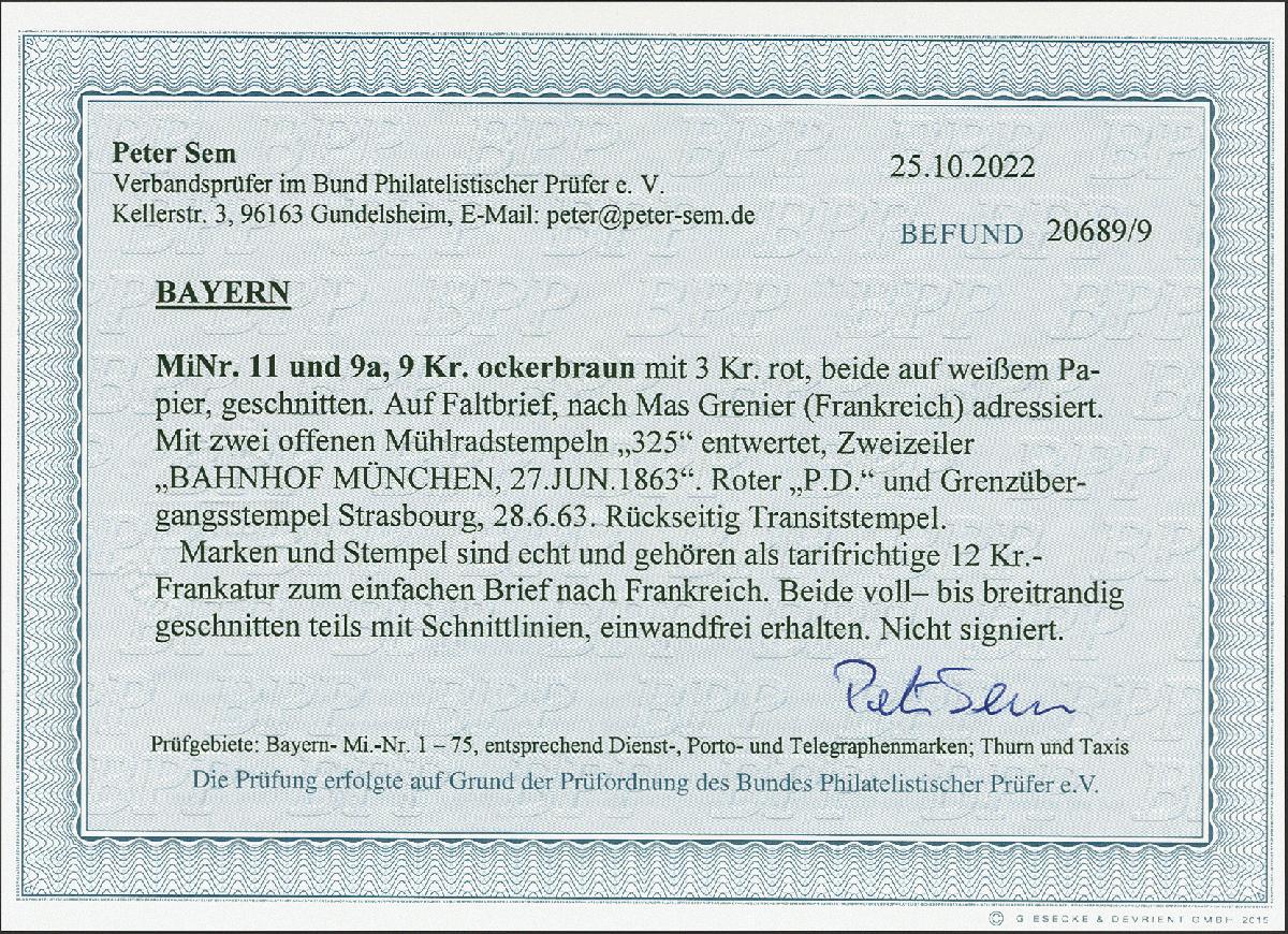 | Zusatzinformationen und Suchstichworte: | 380. Auktion Heinrich Köhler Auktionstermin 25.03.2023 Los 35 3 Kreuzer rot und 9 Kreuzer ocker, beide voll- bis breitrandig, mit oMR "325" und sauber nebengesetztem Langstempel "BAHNHOF MÜNCHEN 27 JUN. 1863" auf Briefhülle nach Frankreich. Einwandfrei. Fotobefund Sem BPP (2022) Ausruf 200,00 EUR Zuschlag 1.500,00 EUR (aus der Sammlung Erivan Haub) |