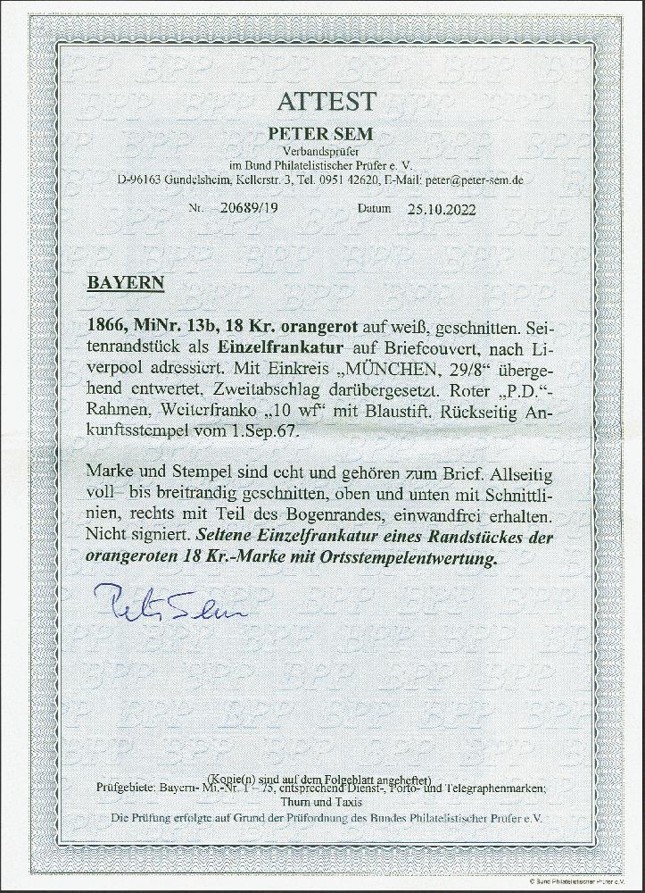 | Zusatzinformationen und Suchstichworte: | 380. Auktion Heinrich Köhler Auktionstermin 25.03.2023 Los 37 18 Kreuzer orangerot, voll- bis breitrandig, rechts mit ca. 2 mm Bogenrand, mit sauber auf- und nebengesetztem Einkreisstempel "MÜNCHEN 29/8 (VII)" auf Briefkuvert nach Liverpool mit Ankunftsstempel. Im Kuvert leichte Beförderungspuren, sonst einwandfrei. Eine attraktive Einzelfrankatur der seltenen Farbe. Fotoattest Sem BPP (2022) Ausruf 1.000,00 EUR Zuschlag 1.800,00 EUR (aus der Sammlung Erivan Haub) |