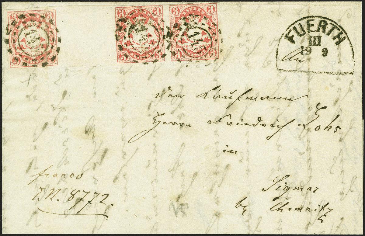 | Zusatzinformationen und Suchstichworte: | 380. Auktion Heinrich Köhler Auktionstermin 25.03.2023 Los 38 1867, 3 Kreuzer karmin im waagerechten Zwischensteg-Dreierstreifen (sogenannte 'Brücke'), farbfrisch und meist voll- bis breitrandig geschnitten, lediglich die mittlere Marke oben kurz berührt, mit oMR "145" auf Faltbrief mit sauber nebengesetztem Halbkreisstempel "FÜRTH 19 9" (1867) nach Sigmar bei Chemnitz. Durch die linke Marke verlaufen 2 unauffällige senkrechte Büge, sonst tadellose, ursprüngliche Erhaltung. Eine große Seltenheit der Bayern-Philatelie; dies ist eine von 2 bisher bekannten gestempelten Brücken der Wappenausgabe und die einzige auf Brief. Fotoattest Stegmüller BPP (2023) Provenienz: John Boker jr. (1988) Ausruf 30.000,00 EUR (aus der Sammlung Erivan Haub) |