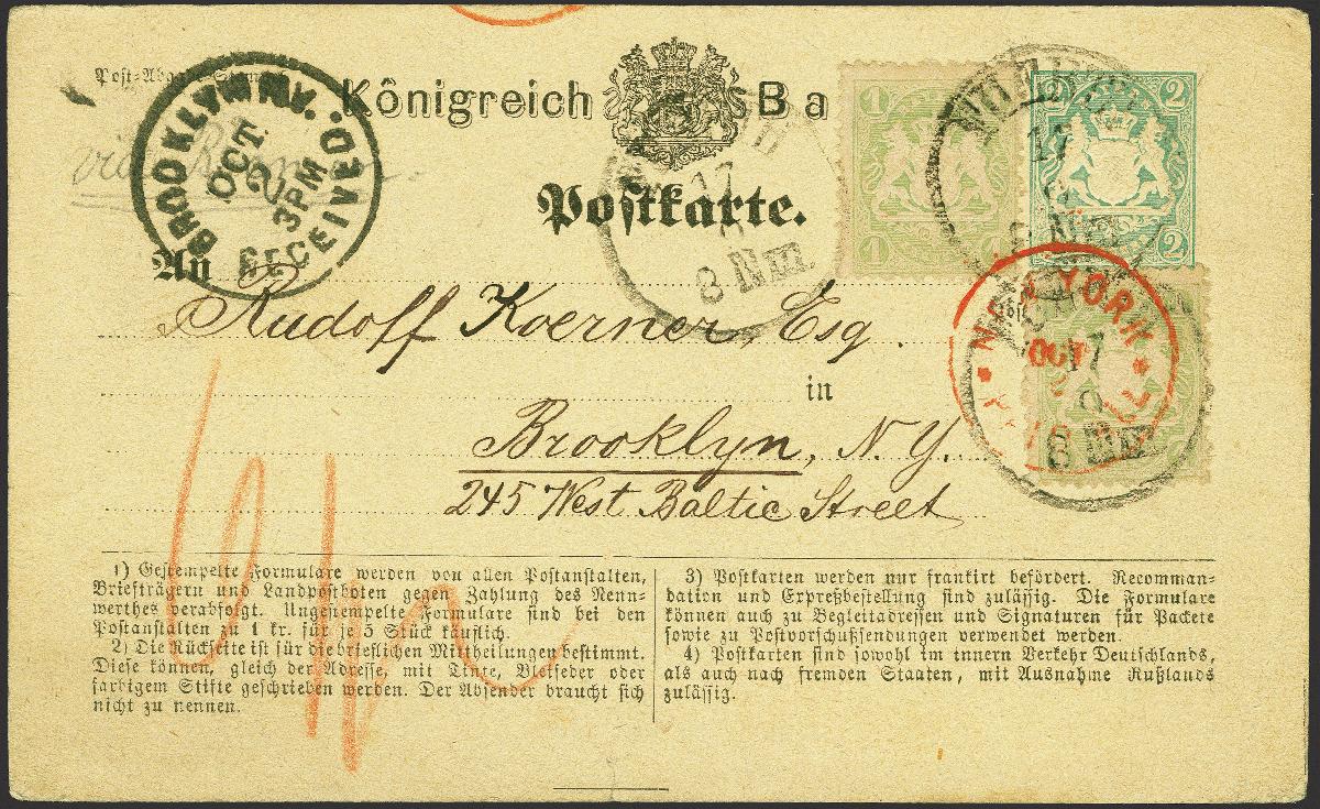 | Zusatzinformationen und Suchstichworte: | 380. Auktion Heinrich Köhler Auktionstermin 25.03.2023 Los 39 1 Kreuzer grün, 2 Einzelwerte, farbfrisch und typisch etwas rau gezähnt (ein Wert minimale Eckstauchung), als Zufrankatur auf Ganzsachenkarte 2 Kreuzer grün, mit Einkreisstempel "FUERTH 17/9" nach Brooklyn, mit auf die Frankatur übergehendem roten Anlandestempel von New York sowie Ankunftsstempel. Sehr schöne und frische Erhaltung. Eine sehr seltene Transatlantik-Karte. Fotoattest Sem BPP (2004) Ausruf 500,00 EUR Zuschlag 950,00 EUR (aus der Sammlung Erivan Haub) |