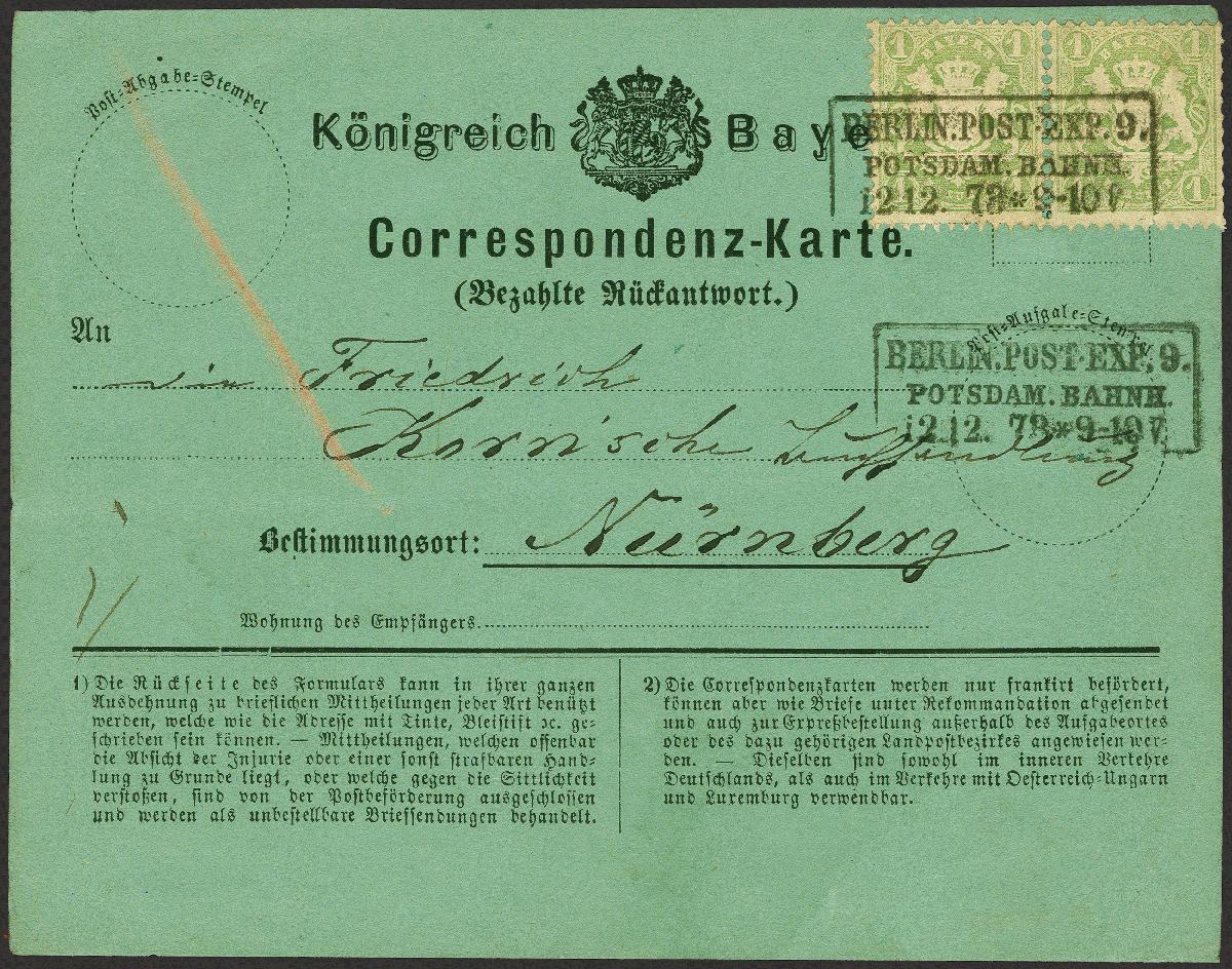 | Zusatzinformationen und Suchstichworte: | 380. Auktion Heinrich Köhler Auktionstermin 25.03.2023 Los 40 1 Kreuzer grün, waagerechtes Paar, farbfrisch und bis auf leichte Bestoßung der rechten Marke gut gezähnt, mit sauber auf- und nebengesetztem Rahmenstempel "BERLIN. POST. EXP. 9 POTSDAM. BAHNH. 12 12 73"auf grüner Korrespondenz-Antwortkarte nach Nürnberg mit Ankunftsstempel. Derartige Antwortkarten mit Stempeln anderer Staaten sind sehr selten. Fotoattest Sem BPP (2022) Ausruf 400,00 EUR Zuschlag 750,00 EUR (aus der Sammlung Erivan Haub) |