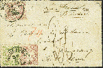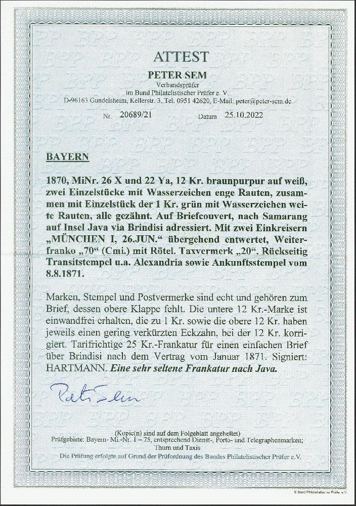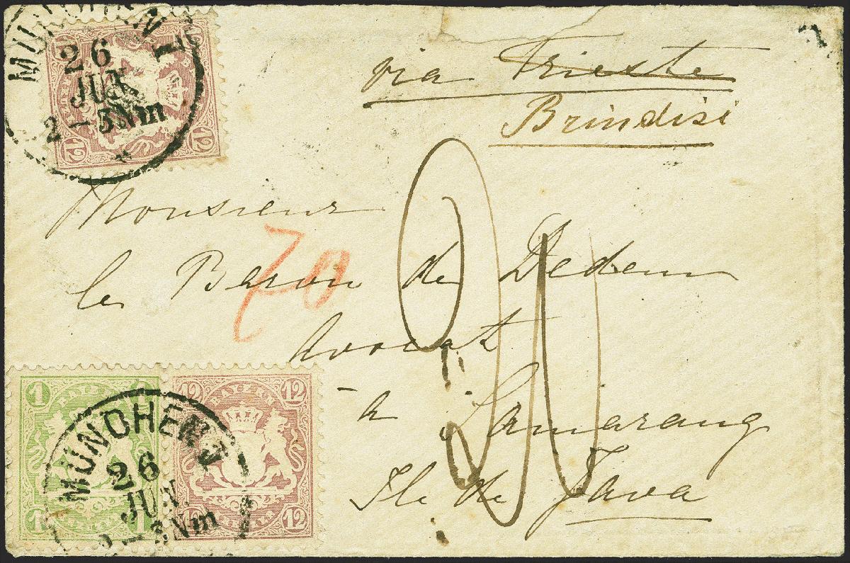 | Zusatzinformationen und Suchstichworte: | 380. Auktion Heinrich Köhler Auktionstermin 25.03.2023 Los 41 12 Kreuzer lila, Wasserzeichen enge Rauten, zwei Werte zusammen mit 1 Kreuzer grün, mit Einkreisstempel "MÜNCHEN 26 JUN" (1871) auf Briefkuvert nach Samarang auf Java. Der Leitvermerk "via Trieste" abgeändert in "Brindisi", rückseitig Transitstempel von Verona, Brindisi, Alexandria und Singapur sowie Ankunftsstempel "SAMARANG 8/8. 1871". Der Brief war korrekt frankiert und bezahlt bis Singapur, für die verbleibende Strecke mit niederländischen Schiffen wurden vom Empfänger noch "20" Cents erhoben. Die 1 Kreuzer und eine 12 Kreuzer jeweils gering verkürzter Eckzahn (bei der 12 Kreuzer korrigiert); rückseitig fehlt ein Teil der Verschlussklappe. Ein attraktiver und ausgesprochen seltener Brief nach Niederländisch Indien. Fotoattest Sem BPP (2022) Ausruf 5.000,00 EUR Zuschlag 19.000,00 EUR (aus der Sammlung Erivan Haub) |