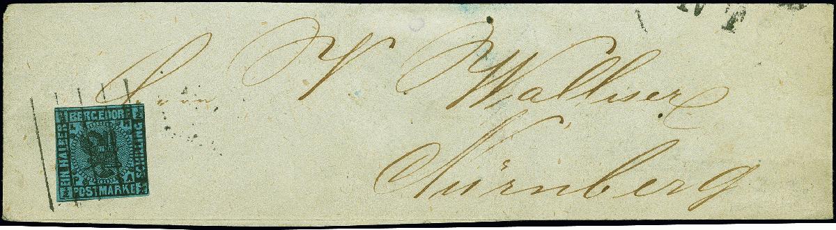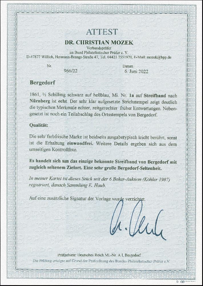 | Zusatzinformationen und Suchstichworte: | 380. Auktion Heinrich Köhler Auktionstermin 25.03.2023 Los 42 ½ Schilling auf hellblau, rechts und links oben etwas berührt, sonst voll- bis breitrandig und farbfrisch, mit klar aufgesetztem Strichstempel auf Streifband nach Nürnberg. Vorderseitig kleiner Teil des Aufgabestempels, rückseitig Bahnpoststempel "HAMBURG/BERLIN". Sehr schöne frische und tadellose Erhaltung. Eine in dieser Form einmalige Drucksachen-Frankatur mit zugleich seltenem Zielort im Postverein. Eine große Seltenheit der Bergedorf-Philatelie. Signiert Kurt Meier, Berlin und Fotoattest Dr. Mozek BPP (2022) Ausruf 3.000,00 EUR Zuschlag 12.000,00 EUR (aus der Sammlung Erivan Haub) |