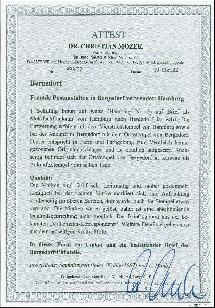 | Zusatzinformationen und Suchstichworte: | 380. Auktion Heinrich Köhler Auktionstermin 25.03.2023 Los 47 1 Schilling braun, 2 Einzelwerte, beide farbfrisch und breitrandig, mit ungewöhnlicher Doppelentwertung durch Hamburger Strichstempel und sauber aufgesetztem Ortsstempel "BERGEDORF 11 10 IV T" (in späterer Zeit wurde auf die Entwertung in Hamburg verzichtet) auf Briefhülle mit nebengesetztem Einkreisstempel "ST. P. A. BAHNHOFS-EXPED. HAMBURG 2 11 10 59" nach Bergedorf mit zusätzlichem rückseitigem Ankunftsstempel. Die Marken waren zur Kontrolle gelöst, bei der rechten Marke markiert sich eine leichte Aufrauhung im oberen Bereich, dort wurde auch der Stempel etwas verstärkt. Ein attraktiver und außerordentlich seltener Brief aus bekannter Korrespondenz. Wir haben nur eine weitere Mehrfachfrankatur dieser Marke mit Bergedorf-Stempel registriert. Signiert Friedl, Wien und Fotoattest Dr. Mozek BPP (2022) Ausruf 3.000,00 EUR Zuschlag 5.000,00 EUR (aus der Sammlung Erivan Haub) |