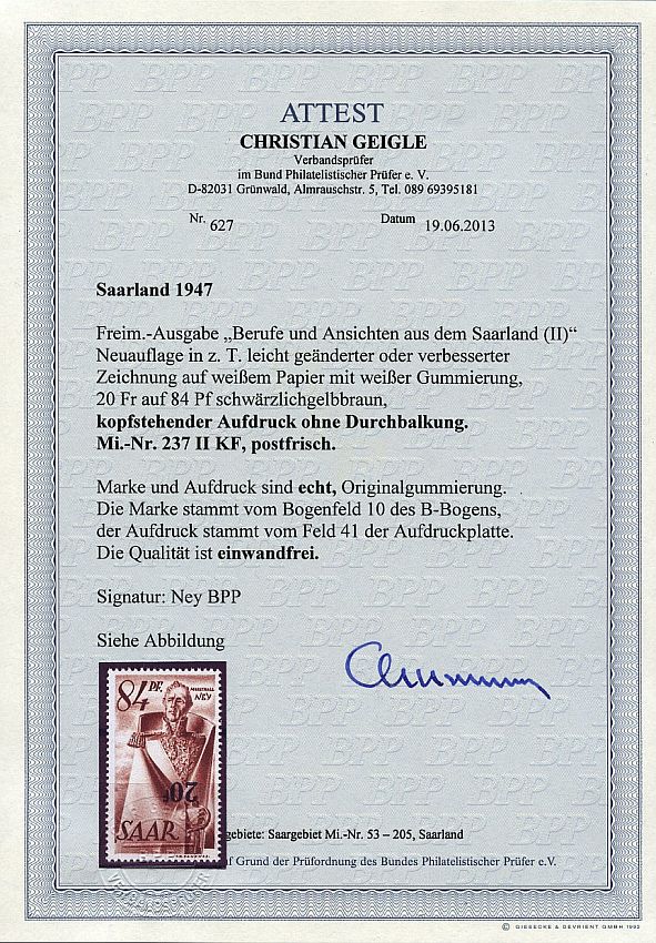 | Prüfgebiet: | Saarland (ab Mi-Nr. 206) |