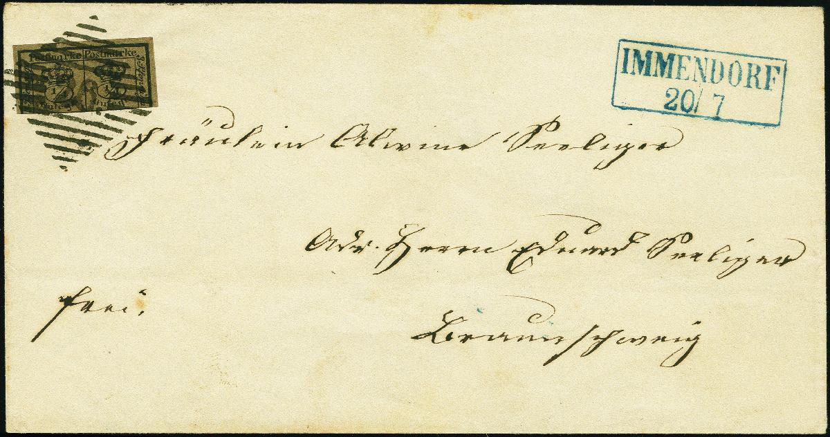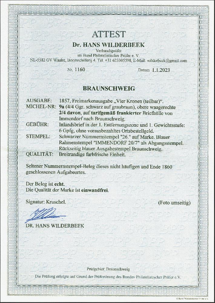 | Zusatzinformationen und Suchstichworte: | 380. Auktion Heinrich Köhler Auktionstermin 25.03.2023 Los 55 1857, 2/4 Gutegroschen auf graubraun, farbfrisch und breitrandig, mit klar aufgesetzter Nr. "26" und glasklar nebengesetztem blauem Rahmenstempel "IMMENDORF 20/7" auf Briefkuvert nach Braunschweig mit Ausgabestempel. Ein sehr schöner Beleg des seltenen Stempels. Signiert Kruschel und Fotoattest Dr. Wilderbeek BPP (2023) Ausruf 300,00 EUR Zuschlag 1.800,00 EUR (aus der Sammlung Erivan Haub) |