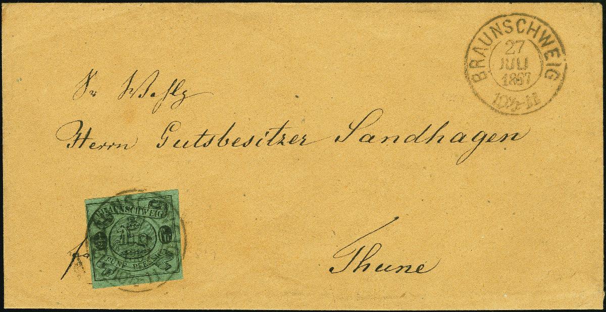 | Zusatzinformationen und Suchstichworte: | 380. Auktion Heinrich Köhler Auktionstermin 25.03.2023 Los 56 1861/63, ½ Gr. auf lebhaftgraugrün, dünnes Papier, farbfrisch und voll- bis breitrandig, mit zentrisch und klar auf- und nebengesetztem Doppelkreisstempel "BRAUNSCHWEIG 27 JULI 1867" als Landpostbestellgebühr auf Briefkuvert (unten etwas umgefaltet) nach Thune im eigenen Landbestellgebiet. Eine attraktive und seltene Einzelfrankatur in einwandfreier Erhaltung. Signiert W. Engel BPP, Fotoattest Dr. Wilderbeek BPP (2023) Ausruf 400,00 EUR Zuschlag 400,00 EUR (aus der Sammlung Erivan Haub) |