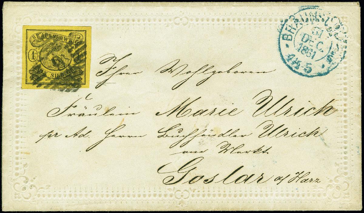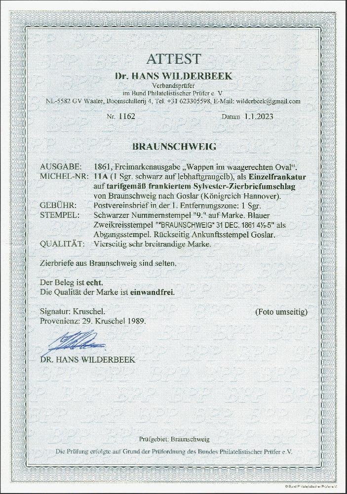 | Zusatzinformationen und Suchstichworte: | 380. Auktion Heinrich Köhler Auktionstermin 25.03.2023 Los 57 1 Silbergroschen auf gelb, farbfrisch und allseits breitrandig, mit sauber Nr. "9" und nebengesetztem blauem Doppelkreisstempel "BRAUNSCHWEIG 31 DEC. 1861" auf kleinem Briefkuvert mit farblos geprägter Zierborde nach Goslar. Schöne und einwandfreie Erhaltung. Ein attraktiver und seltener ziehe Brief. Signiert Kruschel und Fotoattest Dr. Wilderbeek BPP (2023) Ausruf 500,00 EUR Zuschlag 1.800,00 EUR (aus der Sammlung Erivan Haub) |
