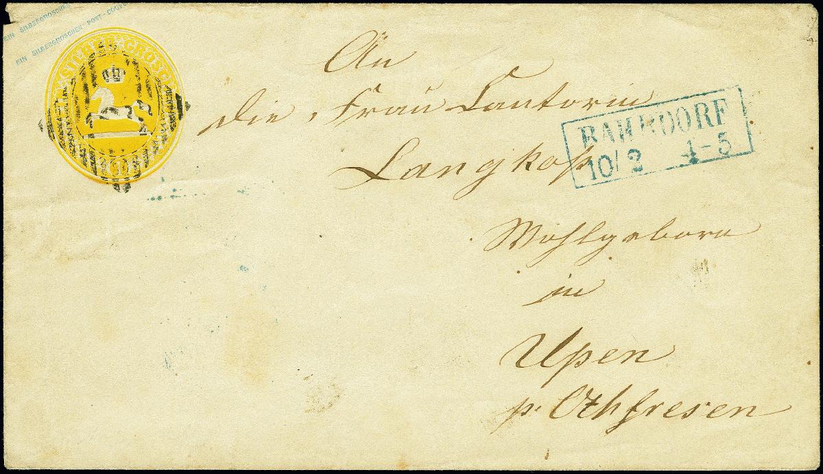 | Zusatzinformationen und Suchstichworte: | 380. Auktion Heinrich Köhler Auktionstermin 25.03.2023 Los 59 1855, Umschlag 1 Silbergroschen gelb, preußischblauer Überdruck, mit sauber aufgesetzter Nr. "2" und sauber nebengesetztem blauem Rahmenstempel "BAHRDORF 10/2" nach Upen bei Othfresen. Eine seltene Entwertung. Fotobefund Dr. Wilderbeek BPP (2023) Ausruf 200,00 EUR Zuschlag 320,00 EUR (aus der Sammlung Erivan Haub) |