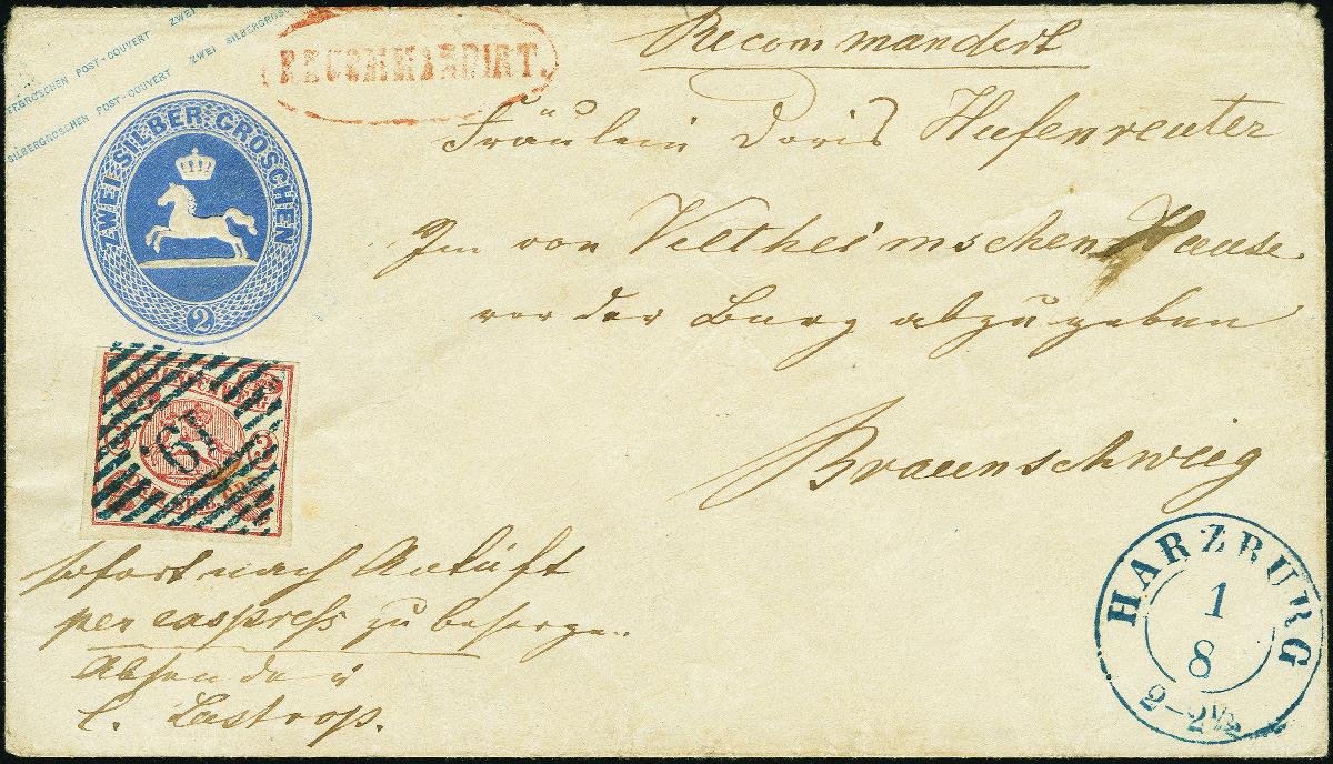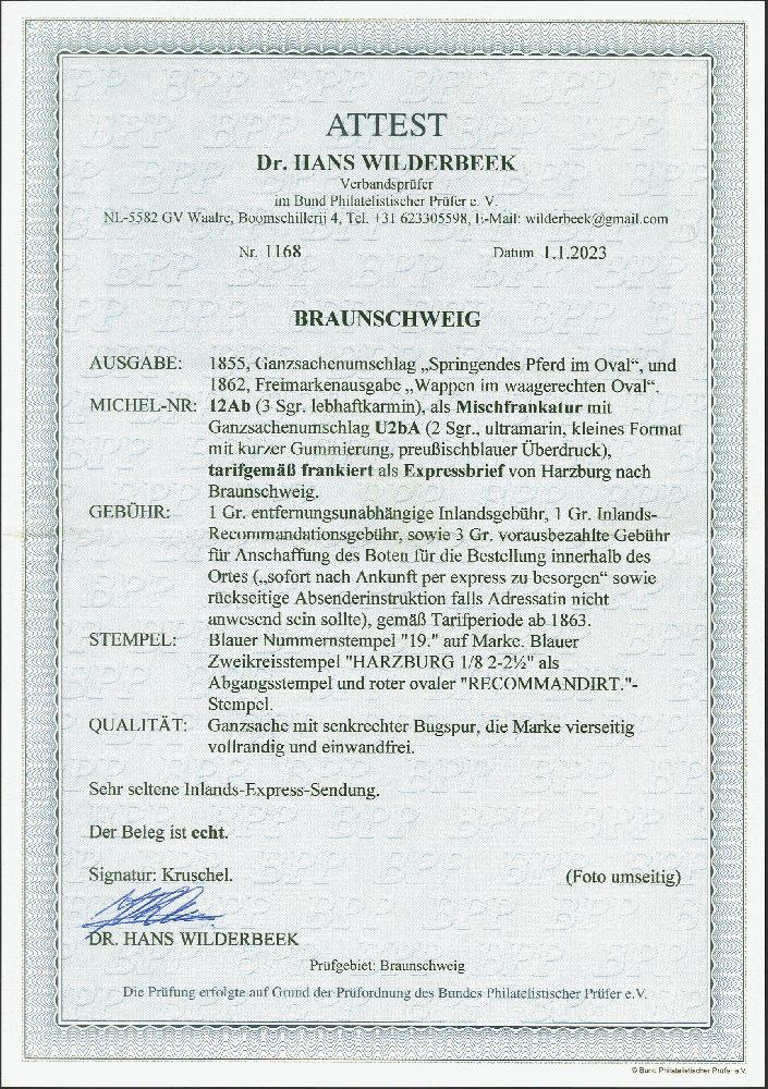 | Zusatzinformationen und Suchstichworte: | 380. Auktion Heinrich Köhler Auktionstermin 25.03.2023 Los 62 1855, Umschlag 2 Silbergroschen ultramarin, preußischblauer Überdruck, mit Zufrankatur 3 Silbergroschen lebhaftkarmin, farbfrisch und voll- bis breitrandig, mit sauber aufgesetzter Nr. "19" und klar nebengesetztem blauem Doppelkreisstempel "HARZBURG 1 8", als Express-Brief (handschr. Anweisung unter der 3 Sgr.-Marke: "sofort nach Ankunft per express zu besorgen...") nach Braunschweig. Das Porto setzt sich zusammen aus 1 Groschen Inlandsgebühr, 1 Groschen Recommandationsgebühr sowie 3 Groschen Express-Gebühr. Das Kuvert senkrecht gefaltet, sonst einwandfrei. Ein attraktiver und sehr seltener Brief; es sind nur wenige Express-Briefe von Braunschweig registriert. Signiert Kruschel, Fotoattest Dr. Wilderbeek BPP (2023) Ausruf 1.000,00 EUR Zuschlag 12.500,00 EUR (aus der Sammlung Erivan Haub) |