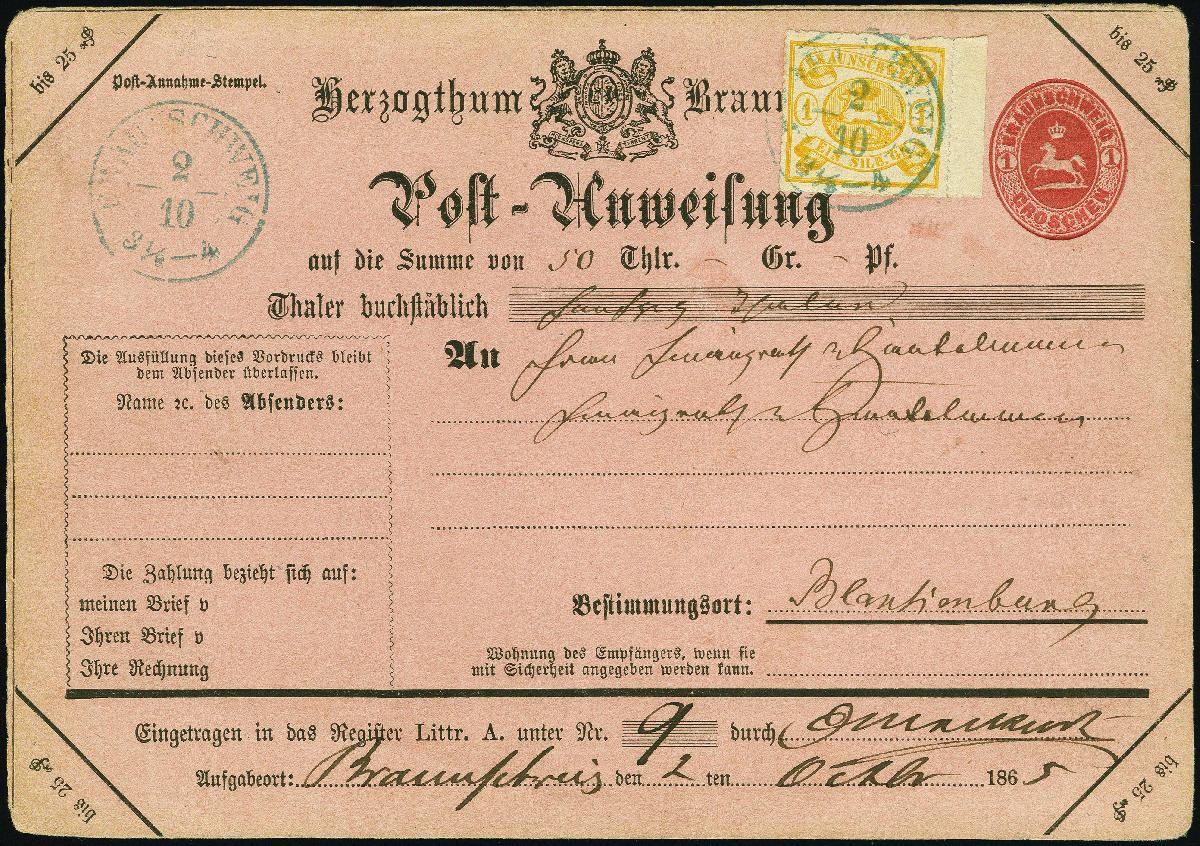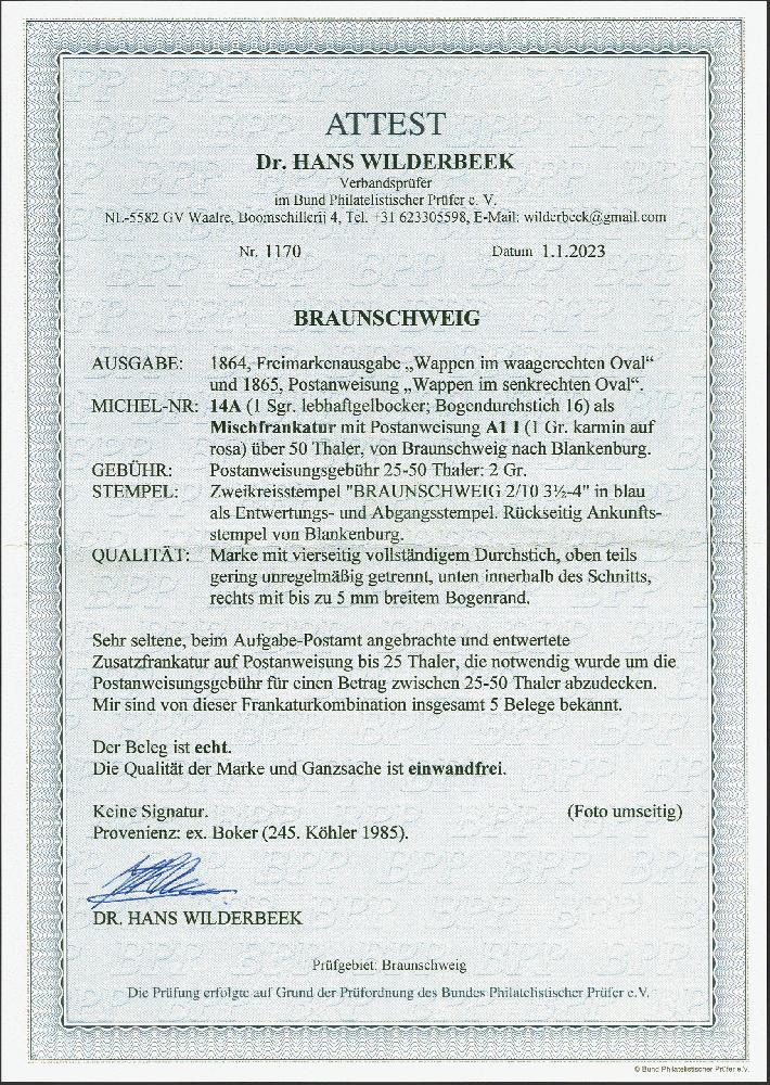 | Zusatzinformationen und Suchstichworte: | 380. Auktion Heinrich Köhler Auktionstermin 25.03.2023 Los 64 Postanweisung 1 Groschen rosa, mit Zufrankatur 1864, 1 Silbergroschen gelbocker, rechts mit ca. 5 mm Bogenrand, tadellos durchstochen 16, mit klarem blauen Doppelkreisstempel "BRAUNSCHWEIG 2/10", für einen Betrag von 50 Talern nach Blankenburg mit rückseitigem Ankunftsstempel und Auszahlungsvermerk. Eine ebenso seltene wie attraktive Kombination, wir haben nur 2 vergleichbare Stücke registriert. Fotoattest Dr. Wilderbeek BPP (2018) Ausruf 1.500,00 EUR Zuschlag 10.500,00 EUR (aus der Sammlung Erivan Haub) |