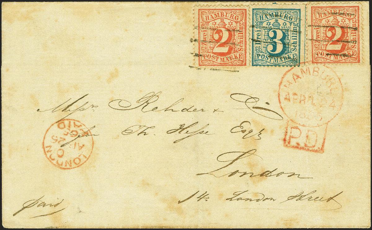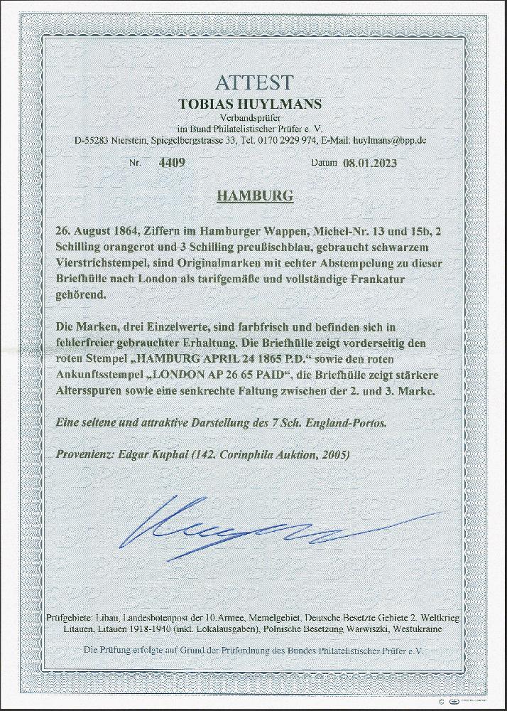| Zusatzinformationen und Suchstichworte: | 380. Auktion Heinrich Köhler Auktionstermin 25.03.2023 Los 73 2 Schilling orangerot, 2 Einzelwerte, abwechselnd geklebt mit 3 Schilling preußischblau, mit sauberen Strichstempeln und nebengesetztem roten "HAMBURG P.D. APRIL 24 1865" auf Briefhülle nach London mit vorderseitigem Eingangsstempel. Die Frankatur ist einwandfrei, die Briefhülle mit Patina. Eine attraktive und seltene Darstellung des 7 Schilling-Portos. Fotoattest Huylmans BPP (2023 Ausruf 800,00 EUR Zuschlag 750,00 EUR (aus der Sammlung Erivan Haub) |