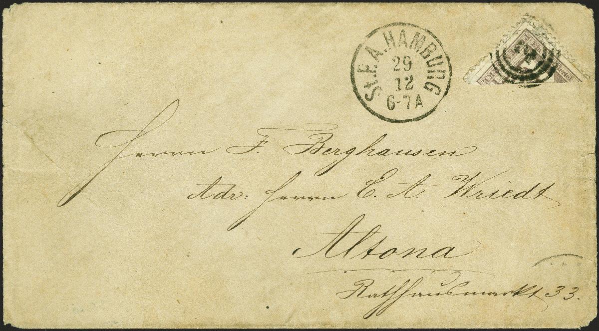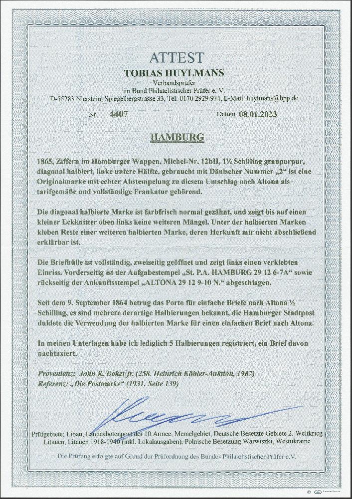 | Zusatzinformationen und Suchstichworte: | 380. Auktion Heinrich Köhler Auktionstermin 25.03.2023 Los 74 1¼ Schilling graupurpur, diagonal halbiert, linke untere Hälfte, farbfrisch und üblich gezähnt, mit sauber aufgesetztem Nummernstempel "2" der 2. Abteilung des Stadtpostamtes und sauber nebengesetztem Einkreisstempel "St. P. A. HAMBURG 29 12" auf Briefkuvert nach Altona. Die Frankatur ist bis auf einen kleinen Eckknitter einwandfrei, unter ihr klebt ein Teil einer weiteren Halbierung. Das Briefkuvert ist 2-seitig geöffnet und hat links einen verklebten Einriss, sonst einwandfrei. Ein attraktiver und außerordentlich seltener Brief. Derartige portogerechte Halbierungen wurden von der Hamburger Stadtpost geduldet, ebenso wie die Halbierungen von Schleswig-Holstein auf Briefen von Altona nach Hamburg. Es sind nur 4 weitere Briefe mit dieser Halbierung registriert, davon einer nachtaxiert. Eine der großen Seltenheiten der Hamburg-Philatelie. Fotoattest Huylmans BPP (2023) B Ausruf 10.000,00 EUR Zuschlag 9.000,00 EUR (aus der Sammlung Erivan Haub) |