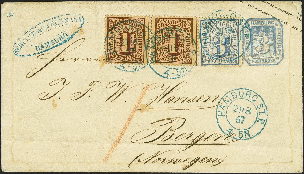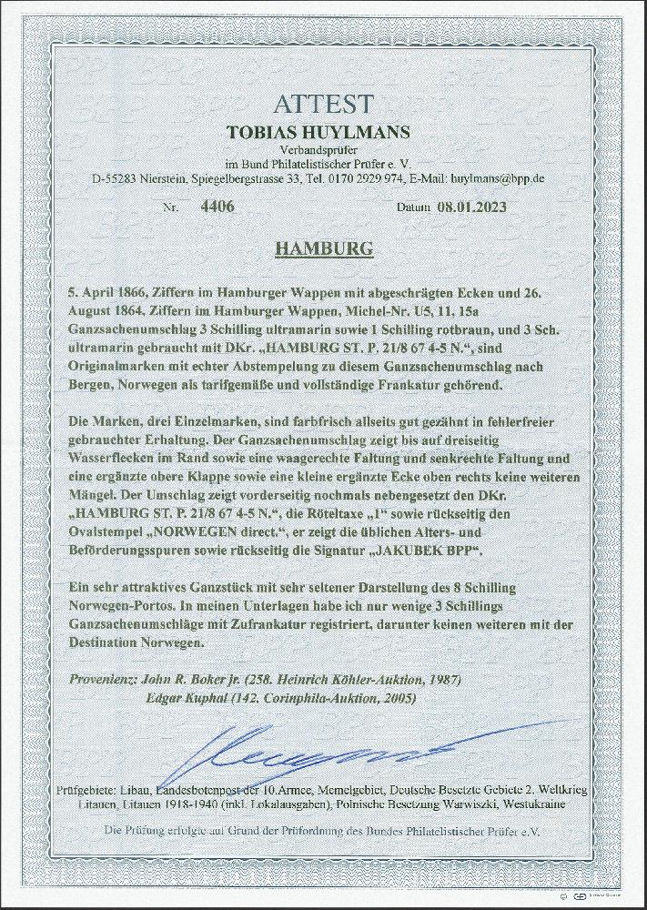 | Zusatzinformationen und Suchstichworte: | 380. Auktion Heinrich Köhler Auktionstermin 25.03.2023 Los 76 1866, Umschlag 7 Schilling lilarot mit Zufrankatur 1864,1 Schilling rotbraun, mit sauber auf- und nebengesetztem blauen Doppelkreisstempel "HAMBURG ST. P. 14 6 67" nach Bergen in Norwegen mit rückseitigem blau Ovalstempel "NORWEGEN direct". Die Marke unten ein Fehlzahn mit dadurch bedingte Randschürfung; der Umschlag oben waagerechte Randfaltung sowie eine Aufrauhung und Fremdgummi unter der Marke (diese war gelöst und ist replatziert). Ein seltener Skandinavien-Brief; der einzig bisher registrierte 7 S.-Umschlag mit Zufrankatur. Fotoattest Huylmans BPP (2023) Ausruf 2.000,00 EUR Zuschlag 2.000,00 EUR (aus der Sammlung Erivan Haub) |