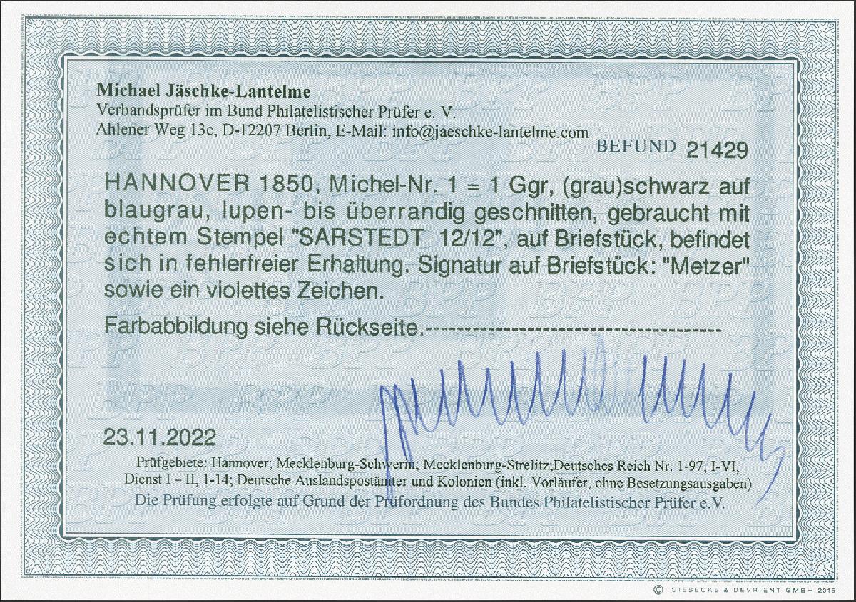 | Prüfer: | Jäschke-Lantelme, Michael (BPP (Bund Philatelistischer Prüfer)) |