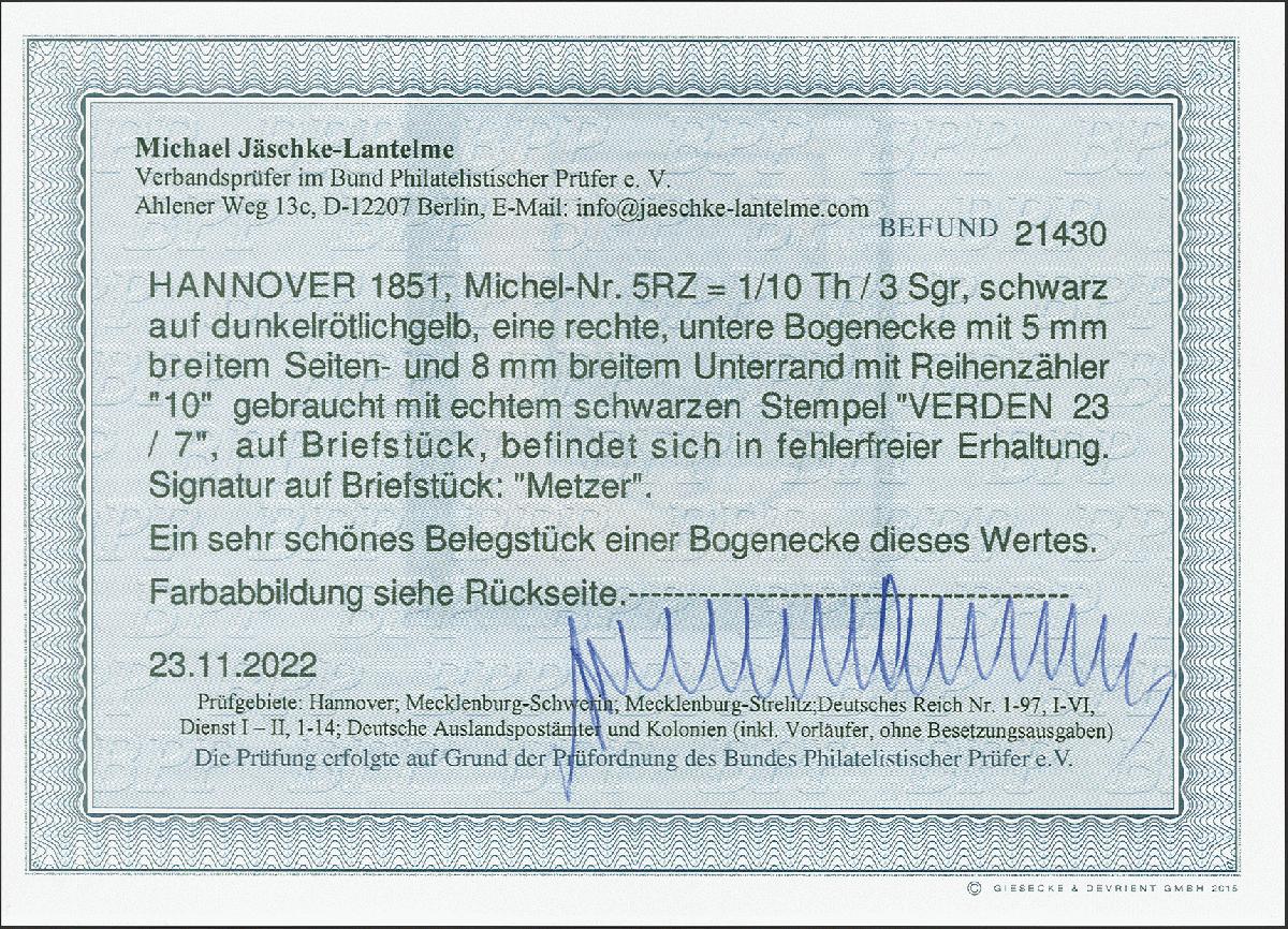 | Prüfer: | Jäschke-Lantelme, Michael (BPP (Bund Philatelistischer Prüfer)) |