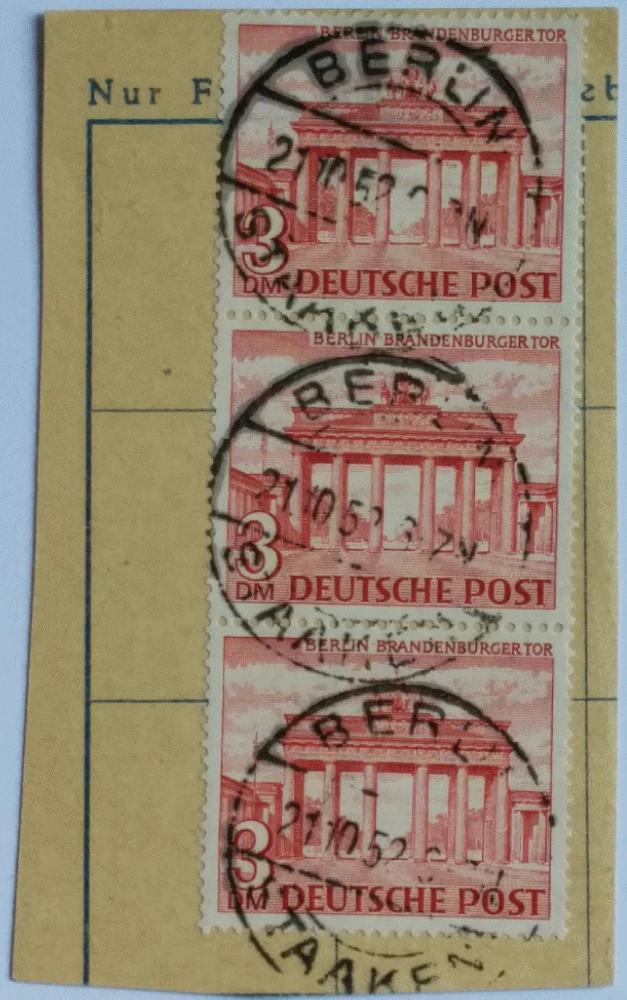 | Zusatzinformationen und Suchstichworte: | Gestempelt, senkrechter Dreierstreifen, Postsparkartenausschnitt |