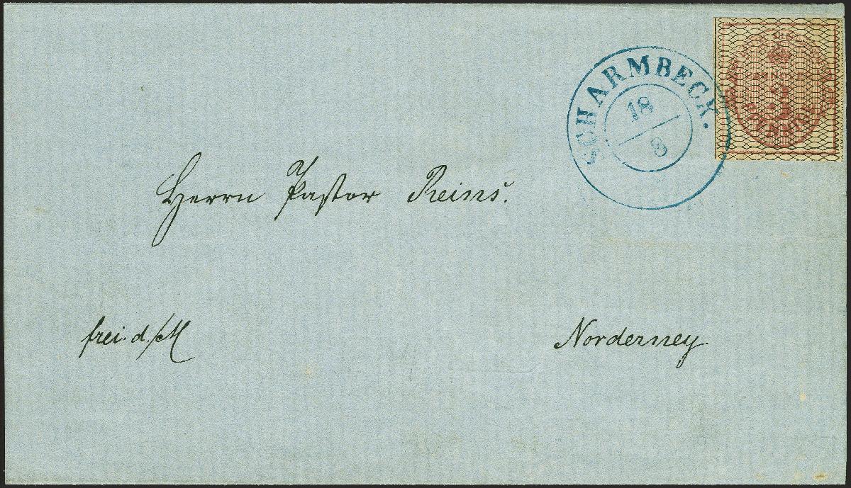 | Zusatzinformationen und Suchstichworte: | 380. Auktion Heinrich Köhler Auktionstermin 25.03.2023 Los 87 3 Pfennige schwarz genetzt, farbfrisch und allseits breitrandig, mit klar übergehend aufgesetztem Doppelkreisstempel "SCHARMBECK 18/8" auf vollständiger Drucksache (Vertreteranzeige einer Zigarrenhandlung) an Pastor Reins auf Norderney. Rückseitig zwei kleine Fehlstellen im Briefpapier hintergeklebt, sonst tadellose und sehr schöne Erhaltung. Fotoattest Jäschke-L. BPP (2022) Ausruf 200,00 EUR Zuschlag 540,00 EUR (aus der Sammlung Erivan Haub) |