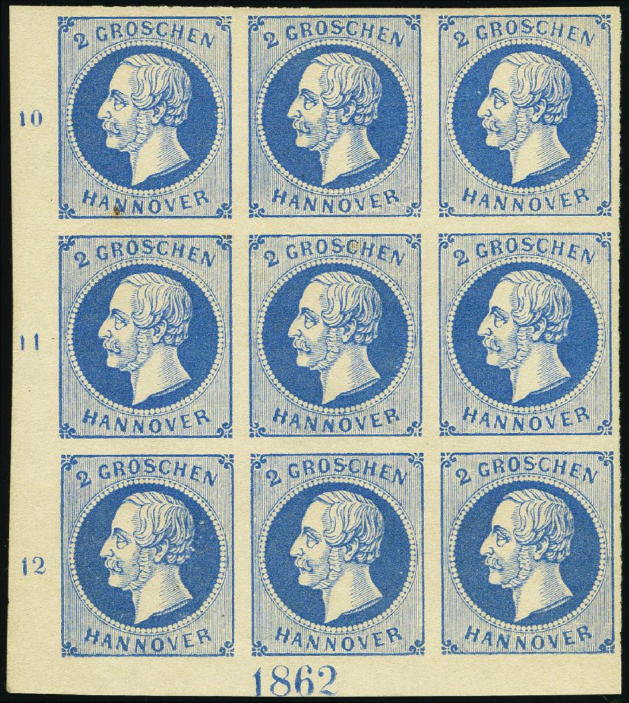 | Zusatzinformationen und Suchstichworte: | 380. Auktion Heinrich Köhler Auktionstermin 25.03.2023 Los 88 2 Groschen lebhaftultramarin im 9er-Block aus der linken unteren Bogenecke mit Jahreszahl "1862" und Rheihenzählern "10" bis "12", farbfrisch und allseits breitrandig, ungebraucht, 7 Werte postfrisch. Eine seltene Einheit. Fotoattest Jäschke-L. BPP BPP (2022) Ausruf 300,00 EUR Zuschlag 340,00 EUR (aus der Sammlung Erivan Haub) |